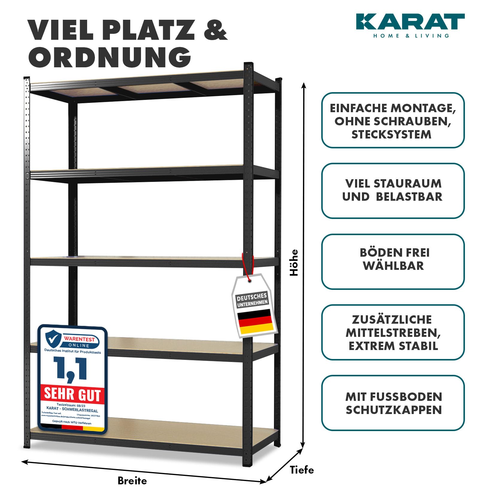- Hohe Belastbarkeit: Das Regalsystem ist für hohe Lasten konzipiert und bietet eine enorme Tragkraft, verteilt auf fünf widerstandsfähige Böden pro Regal.