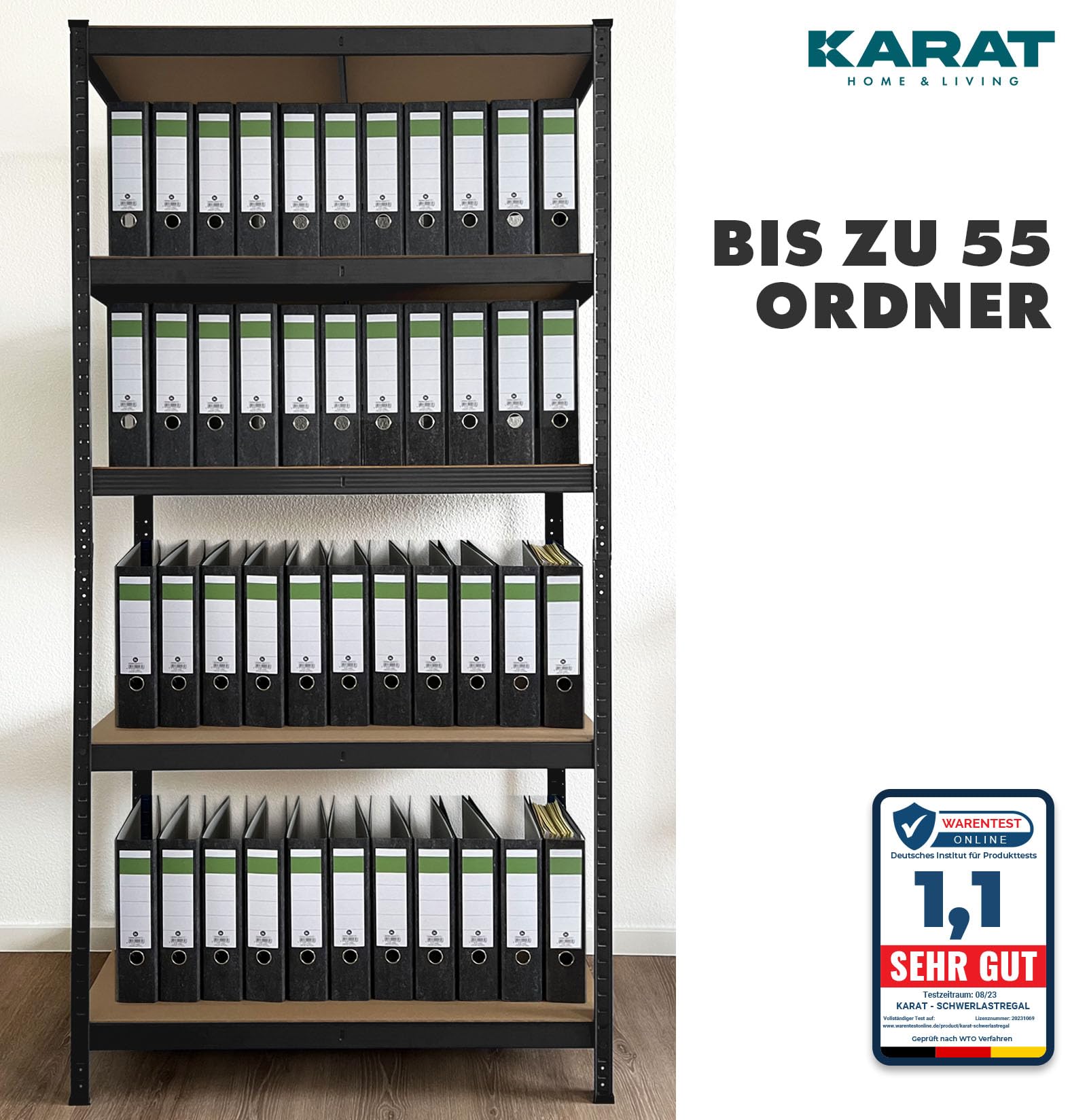Jeder der fünf Böden pro Regal ist für eine hohe Belastbarkeit ausgelegt und hat eine Tragkraft von bis zu 175 kg bei gleichmässiger Lastenverteilung. Das gesamte Regal trägt somit bis zu 875 kg.