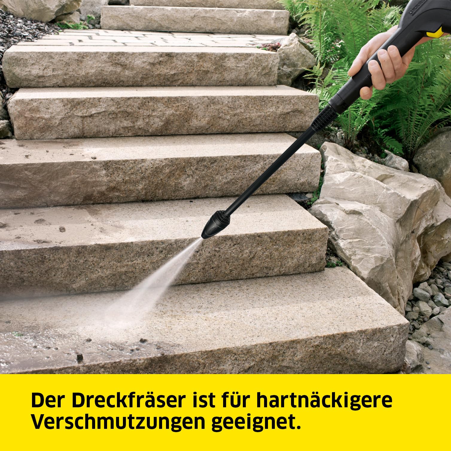 Mit einem maximalen Druck von 120 bar und einer Wasserfördermenge von bis zu 380 Litern pro Stunde bewältigt der K 3 eine Flächenleistung von rund 25 m²/h. Für jede Aufgabe steht das passende Zubehör bereit: Das Vario Power-Strahlrohr ermöglicht eine stufenlose Druckanpassung durch einfaches Drehen, ideal für empfindlichere Oberflächen. Bei hartnäckigen Verschmutzungen, wie zum Beispiel auf vermoosten Steinplatten, sorgt der Dreckfräser mit seinem rotierenden Punktstrahl für maximale Reinigungskraft.