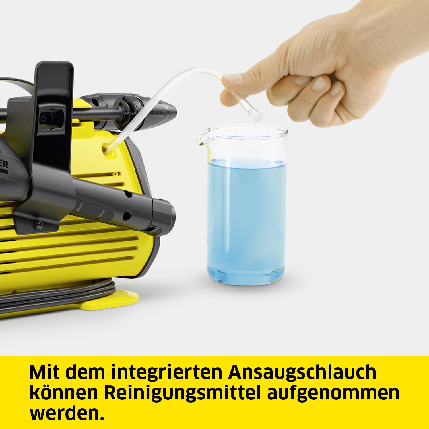Das Gerät verfügt über einen Ansaugmechanismus für Reinigungsmittel. Sie können den dafür vorgesehenen Ansaugschlauch in eine Flasche mit Reinigungsmittel stecken. Das Mittel wird dann bei niedrigem Druck automatisch dem Wasserstrahl beigemischt, um die Reinigungswirkung zu verstärken.