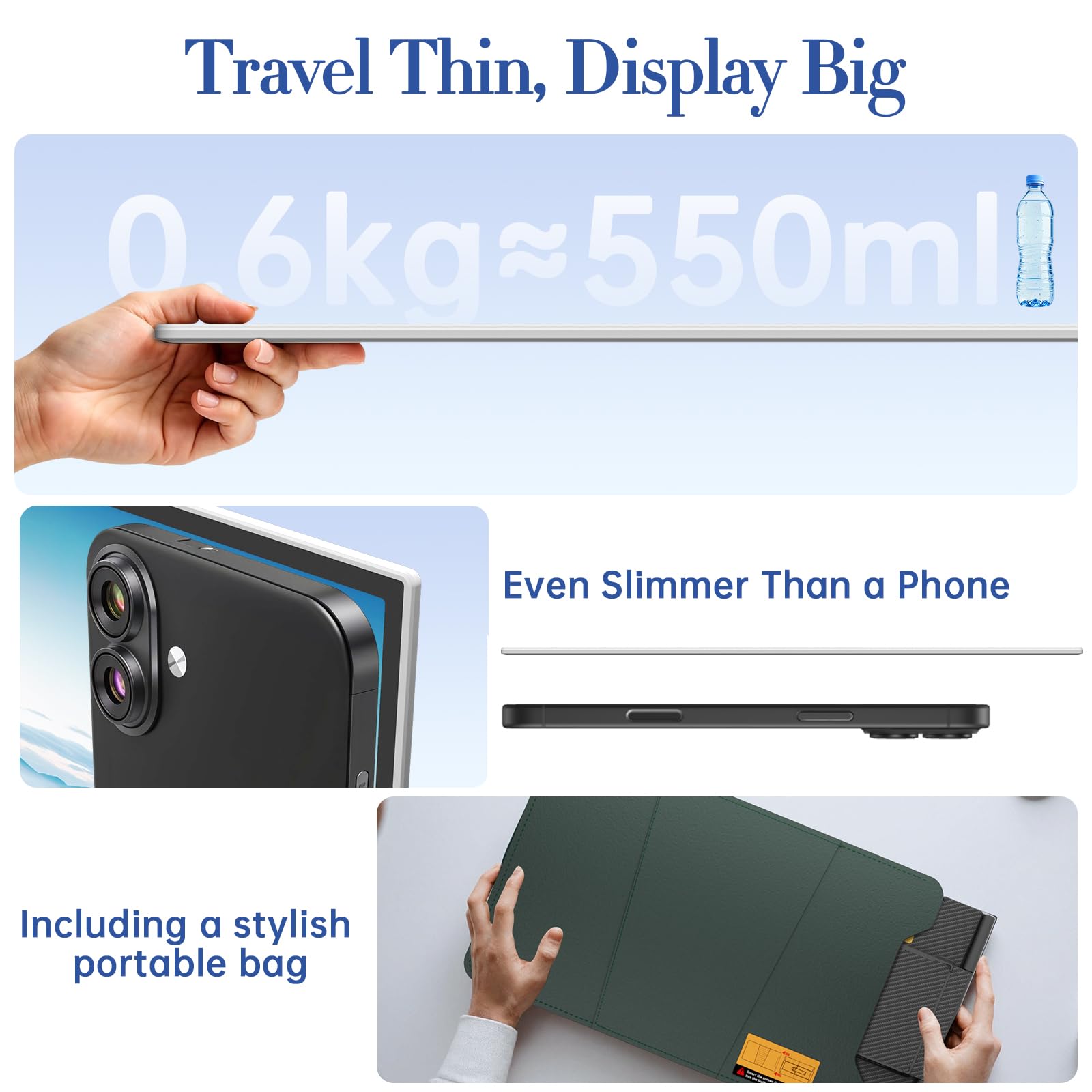 Der Monitor wiegt nur 0,6 kg und ist damit extrem leicht. Sein robustes Gehäuse aus CNC-gefrästem Aluminium, das auch in der Luft- und Raumfahrt verwendet wird, und die mitgelieferte Schutztasche machen ihn zum perfekten, langlebigen Begleiter für Geschäftsreisen, digitale Nomaden oder das Home-Office.