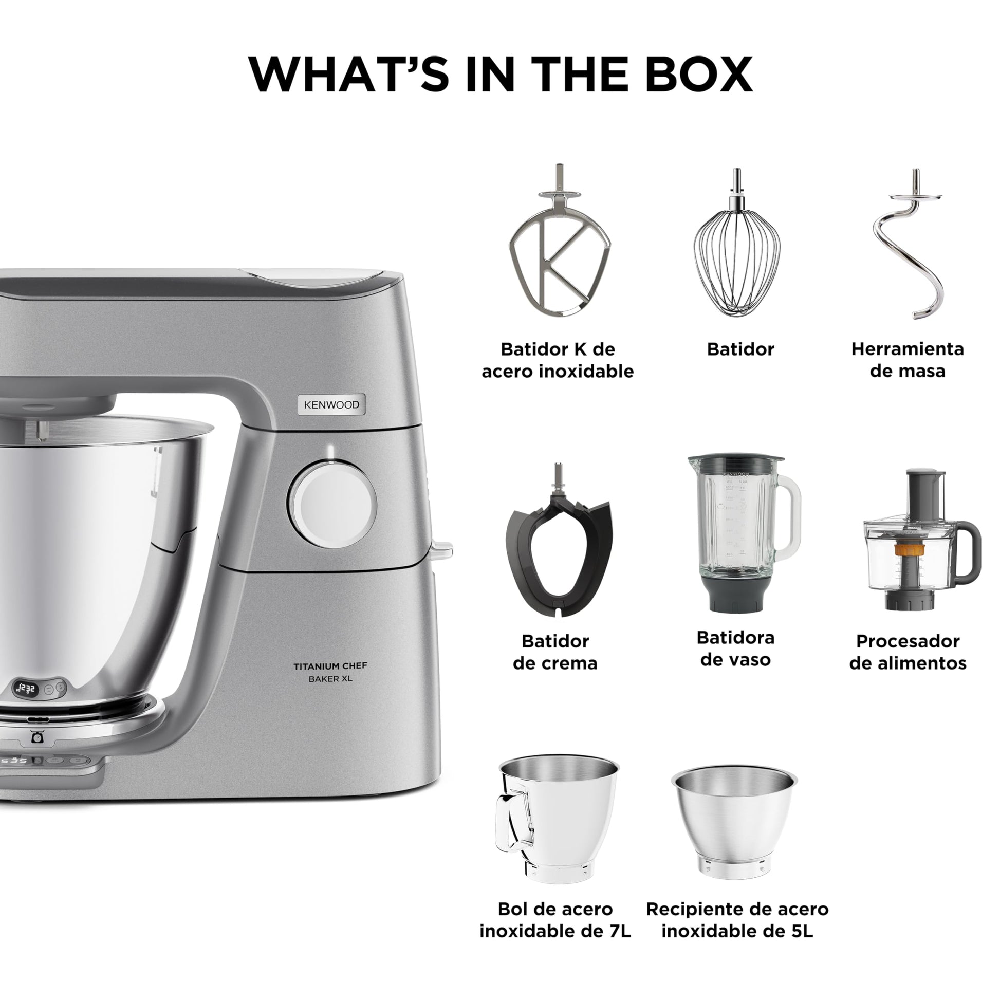 Dieses Modell wird mit einem umfangreichen Zubehörpaket geliefert. Es beinhaltet zwei Rührschüsseln (7L & 5L), ein 4-teiliges Patisserie-Set aus Edelstahl (K-Haken, Ballonschneebesen, Knethaken, Flexi-Rührelement), einen Glas-Mixaufsatz, einen Multi-Zerkleinerer sowie einen Spritzschutz und einen Spatel.