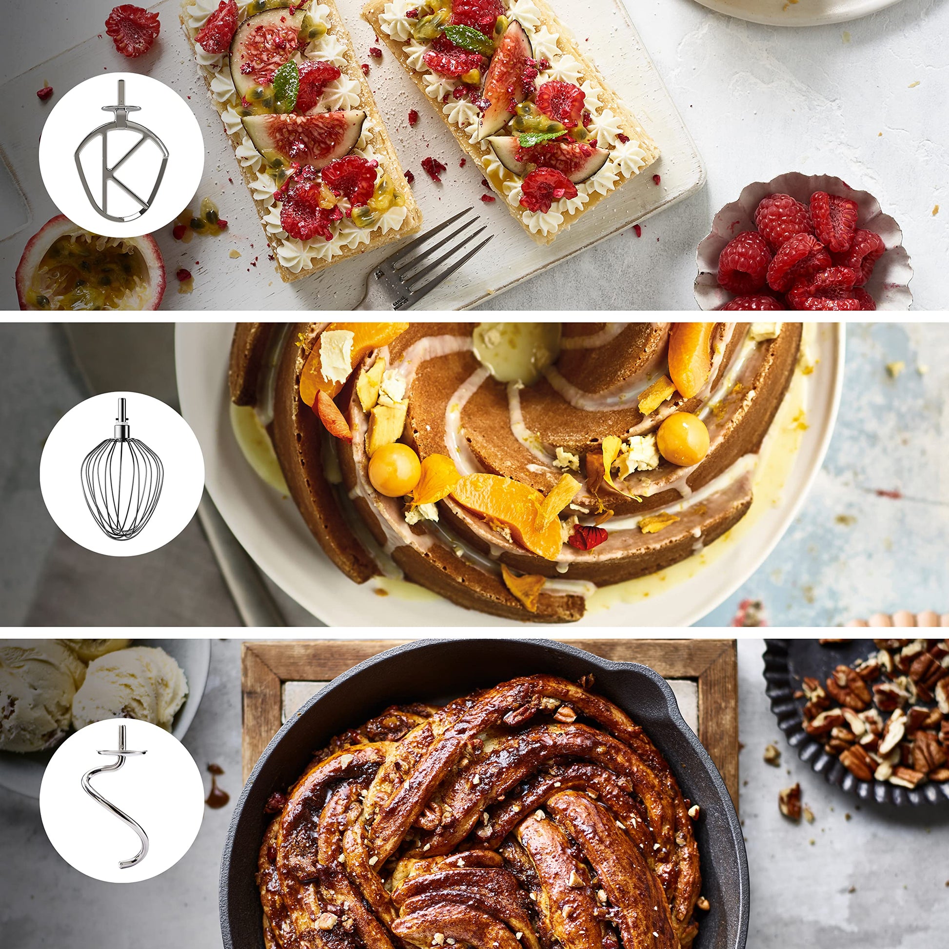 - Umfangreiches Zubehörpaket: Beinhaltet ein 4-teiliges Patisserie-Set (K-Haken, Ballonschneebesen, Knethaken, Flexi-Rührelement), einen Glas-Mixaufsatz, einen Multi-Zerkleinerer, Spritzschutz und Spatel.