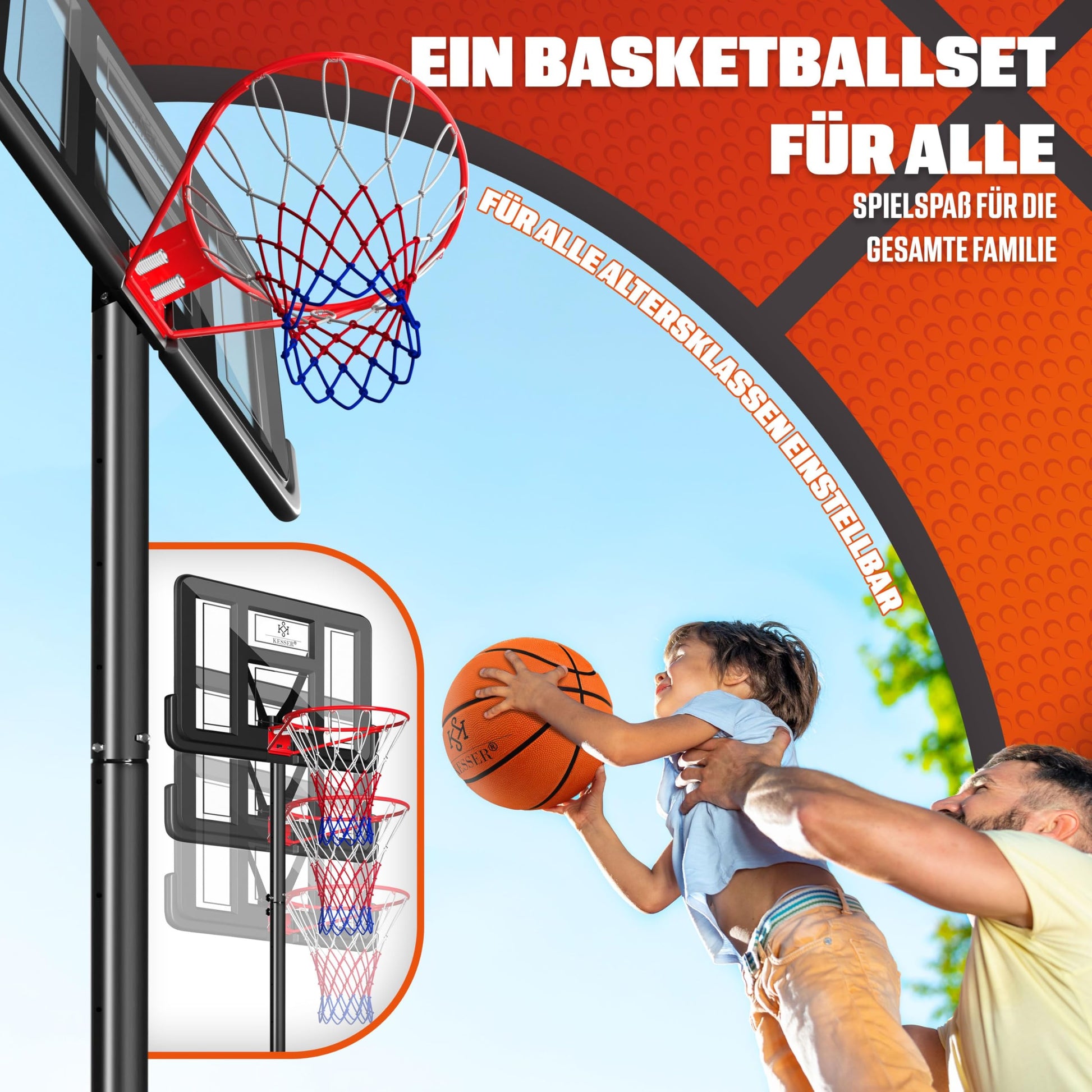 Das Set ist sofort spielbereit und enthält alles, was Sie für das erste Match benötigen: einen Basketball, eine passende Luftpumpe, zwei Netze sowie eine praktische Ballablage direkt am Sockel des Korbes.
