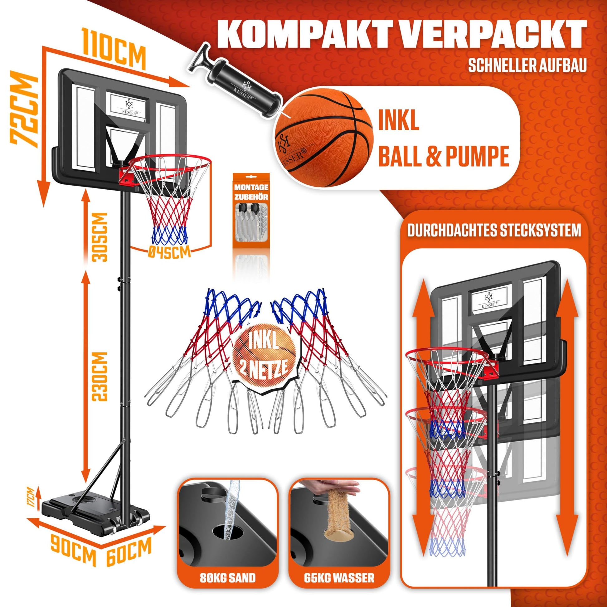 - Professionelle Spielhöhe: Stufenlos verstellbar von 230 cm bis zur offiziellen Höhe von 305 cm.