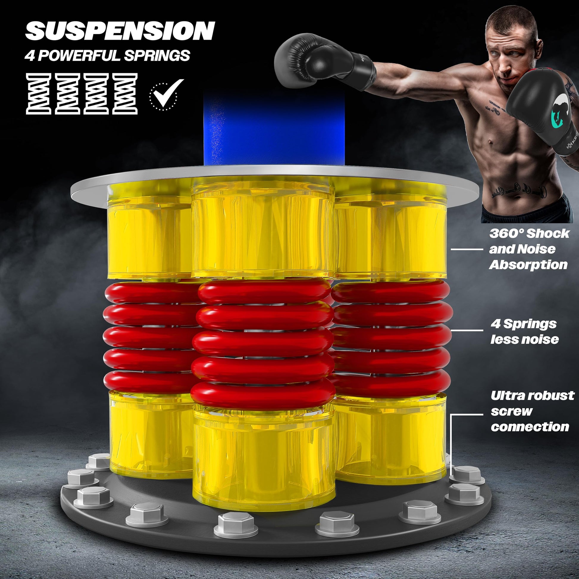 Die robuste Konstruktion mit starken Federn und einer soliden Schraubverbindung sorgt für aussergewöhnliche Stabilität bei jedem Schlag und Tritt. Das durchdachte Dämpfungssystem fängt die Energie effizient ab, was nicht nur Ihre Gelenke schont, sondern auch ein leiseres Training ermöglicht – ideal für den Gebrauch zu Hause.