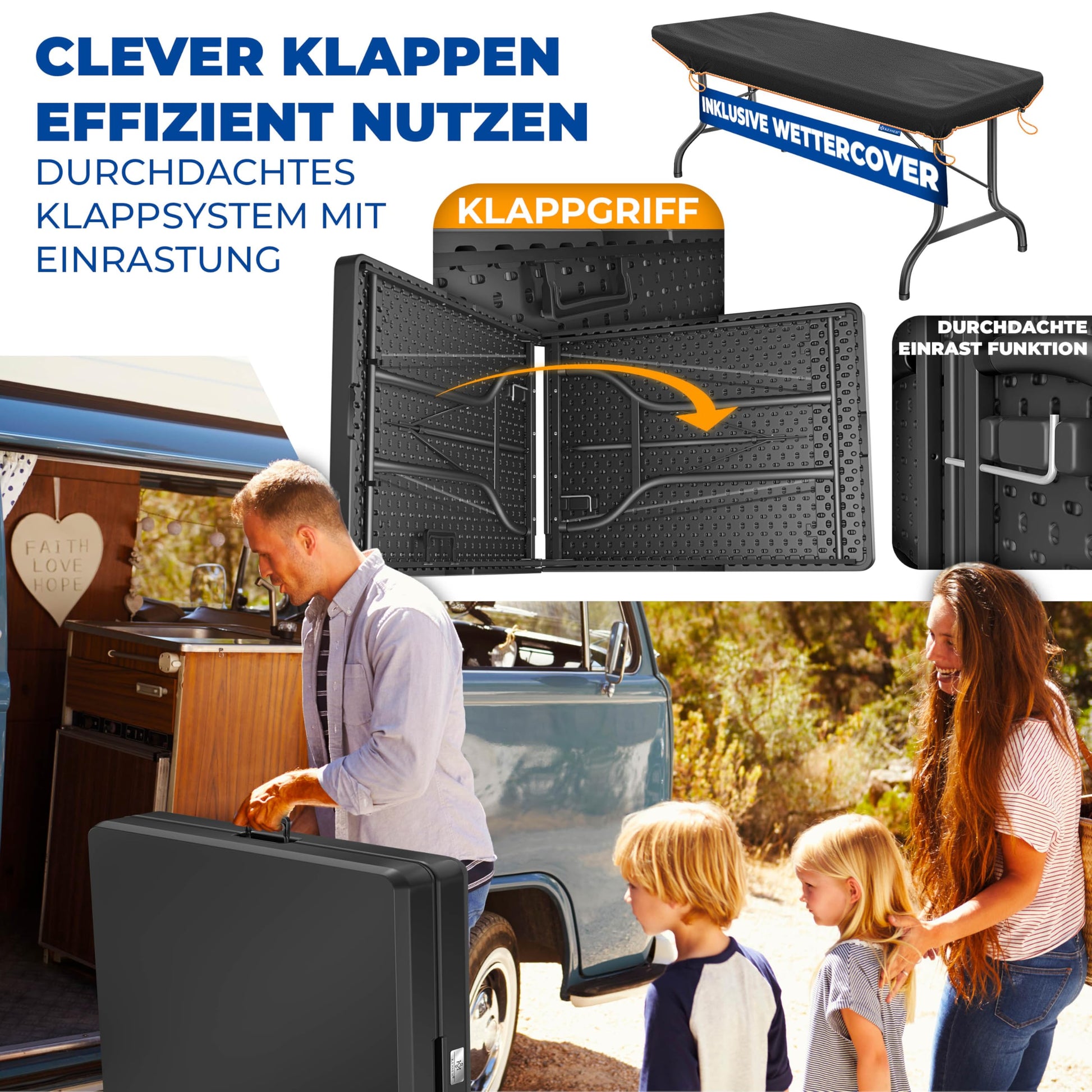 Yes, absolutely. The tabletop is made of weatherproof plastic and the solid steel frame is powder-coated, making the table ideal for garden parties, camping, or use on the balcony. A protective cover is also included to shield it from rain and UV radiation when not in use.
