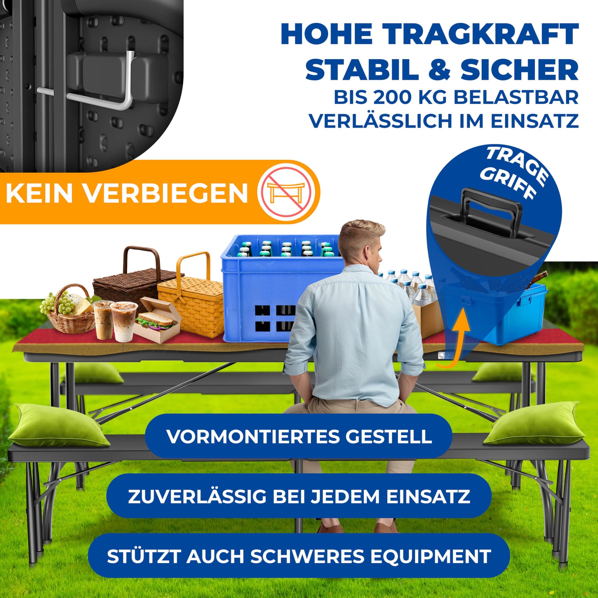 - Maximale Mobilität: Dank der cleveren Klappfunktion, des integrierten Tragegriffs und eines geringen Gewichts von nur 12 kg lässt sich der Tisch mühelos transportieren und passt in fast jeden Kofferraum.