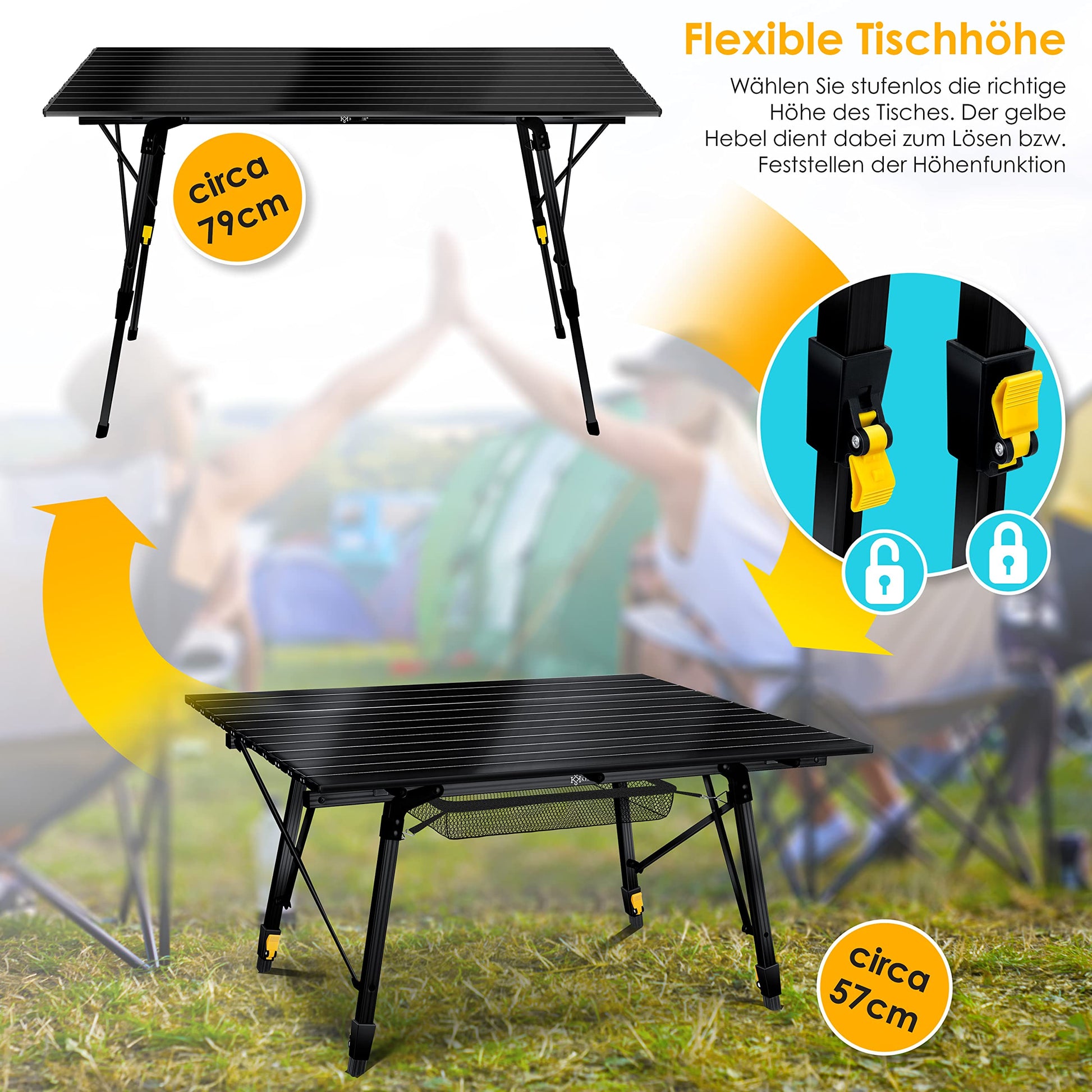 Für einen sicheren Stand, selbst auf unebenem Boden, sorgt das stabile X-Gestell aus Aluminium. Das clevere Snap-Lock-System gewährleistet, dass der Tisch schnell und sicher aufgebaut ist und sich die Platte auch unter Last nicht durchbiegt. Ein besonderes Extra ist das praktische Netz, das unter der Tischplatte eingespannt werden kann. Es schafft zusätzlichen Stauraum für Utensilien, Bücher oder Spiele und hält die Tischfläche frei.