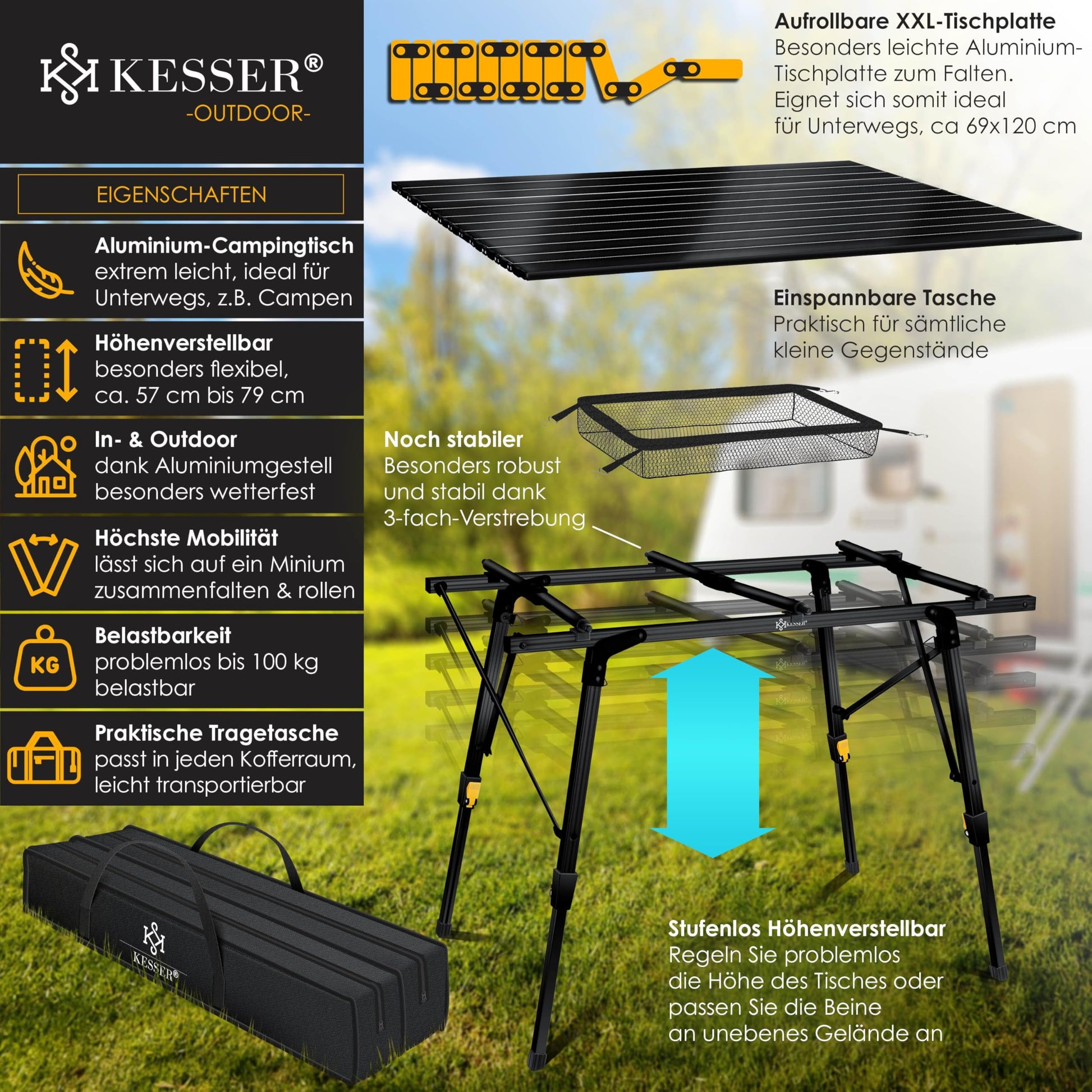 - Grosse, aufrollbare Tischplatte (120x70 cm) aus Aluminium