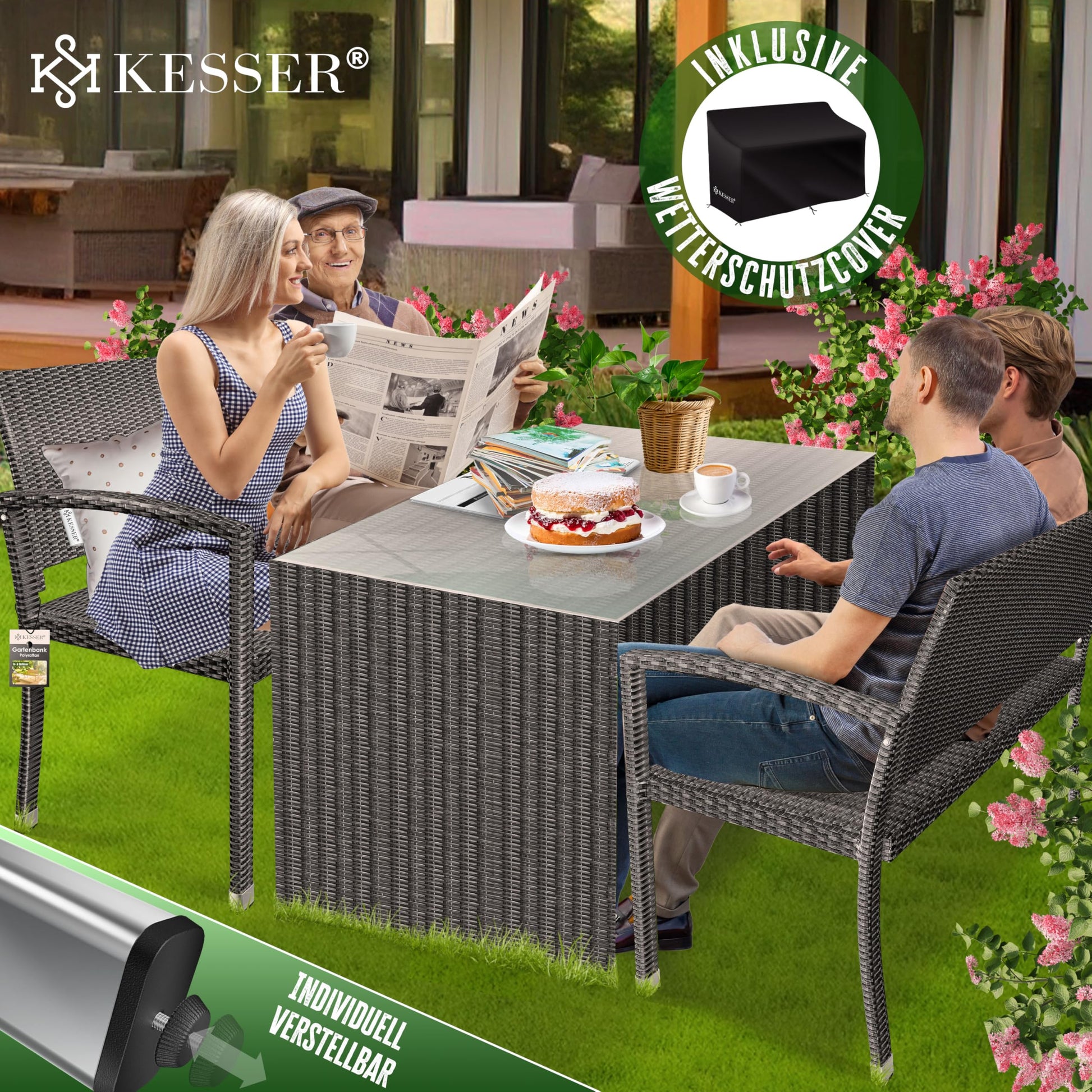 Dank der soliden Konstruktion aus Stahl und dem witterungsbeständigen Polyrattan-Geflecht ist diese Bank eine langlebige Investition. Sie behält über Jahre hinweg ihre Form und Farbe und trotzt den Elementen mit Leichtigkeit. Die Materialien sind UV-beständig, wasserdicht und pflegeleicht, sodass die Bank bei jedem Wetter draussen bleiben kann.
