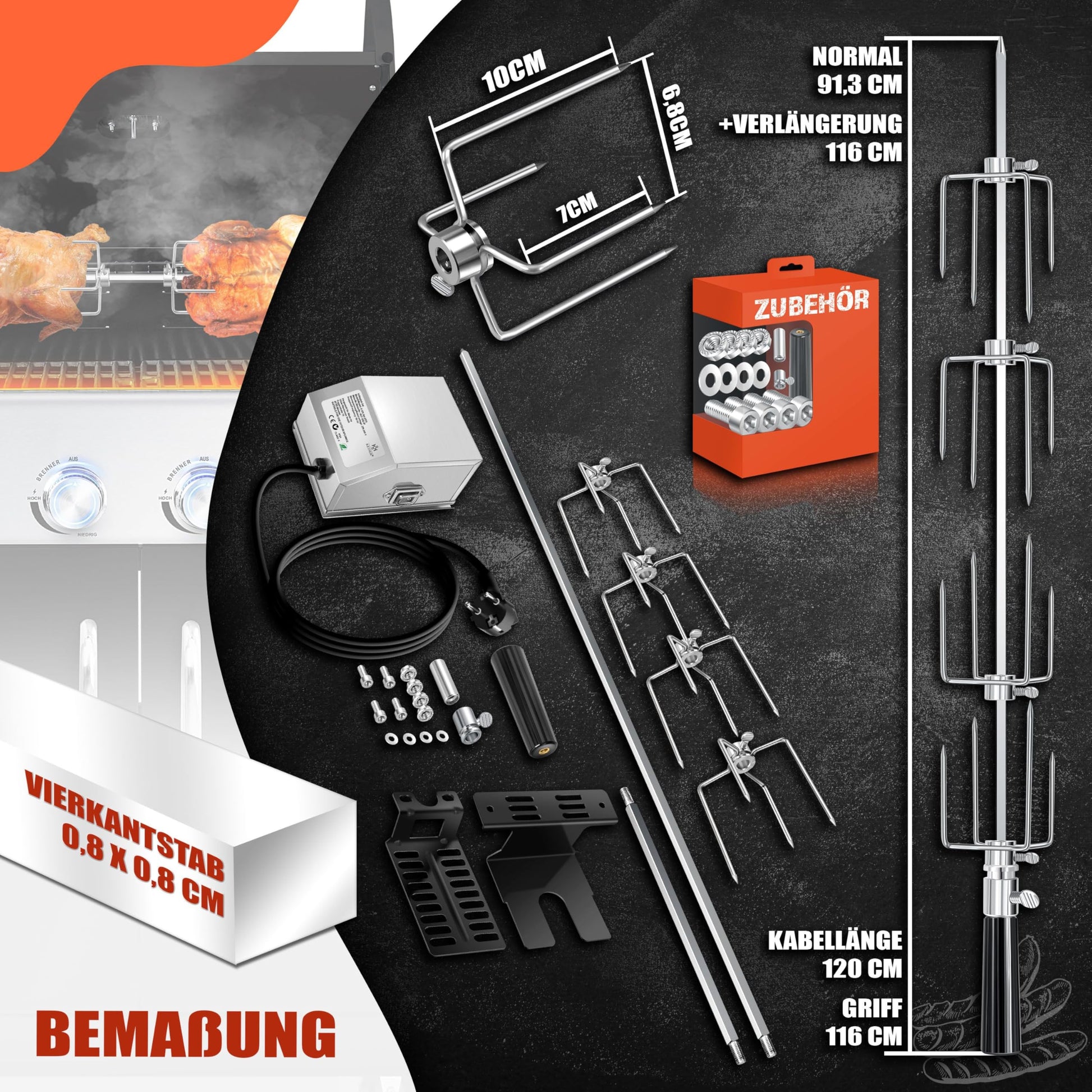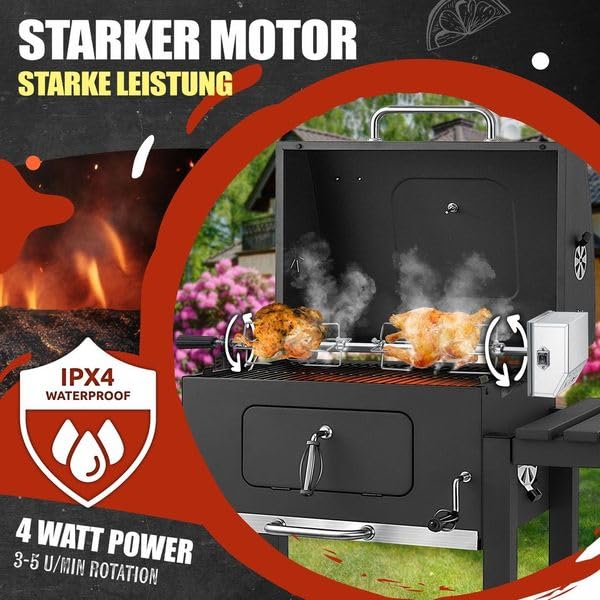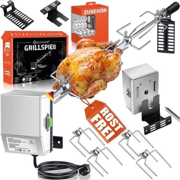 Erweitern Sie die Möglichkeiten Ihres Grills und werden Sie zum Meister der Rotisserie. Dieses elektrische Drehspiess-Set ist die perfekte Ergänzung, um saftige Braten, knusprige Poulets und andere Spezialitäten mühelos zuzubereiten und Ihre Gäste zu begeistern.