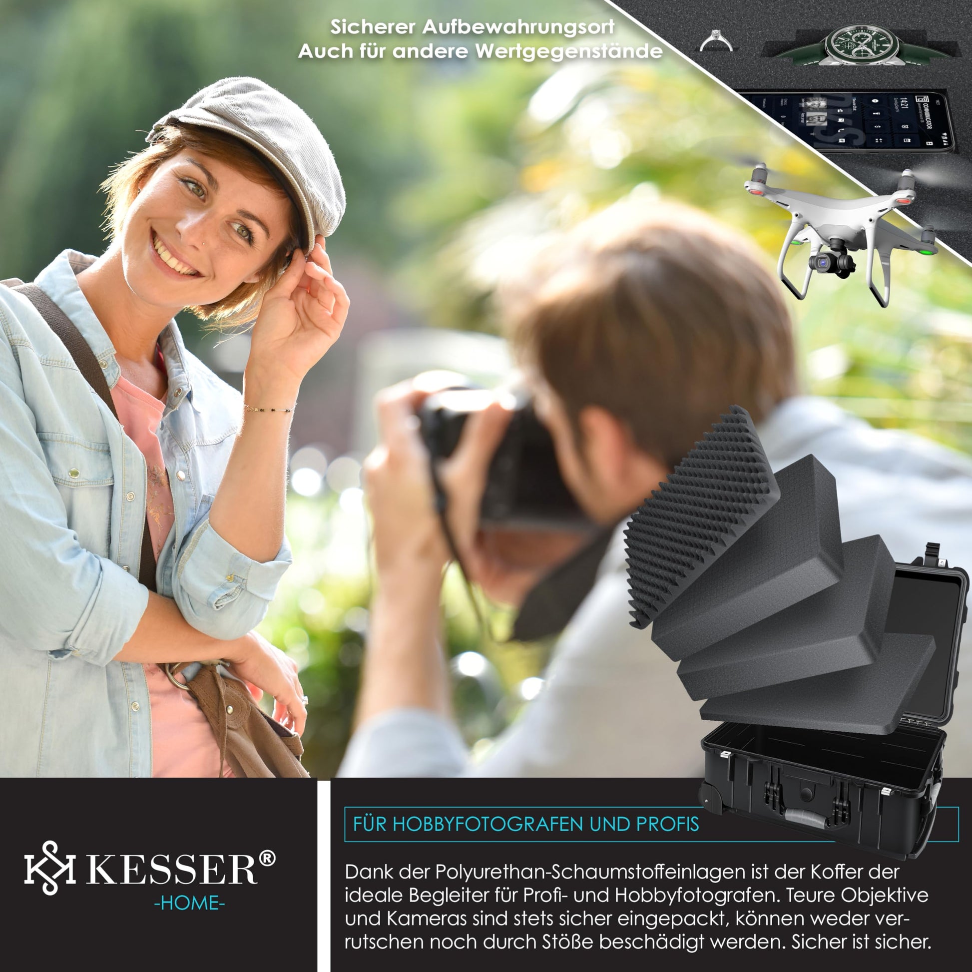 Massgeschneiderter Schutz im Innern: Der Innenraum lässt sich dank der mitgelieferten Schaumstoffeinlagen exakt an Ihr Equipment anpassen. Schneiden Sie den Würfelschaumstoff einfach passgenau zu, um Kameras, Objektive und Zubehörteile rutschfest und stossgeschützt zu lagern. So hat alles seinen festen Platz und ist optimal vor Erschütterungen gesichert.