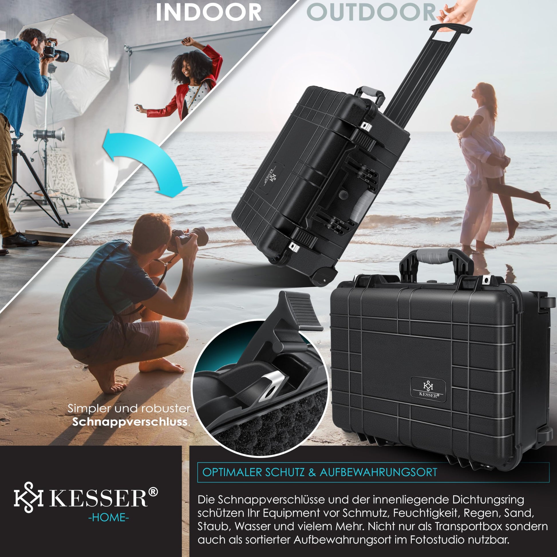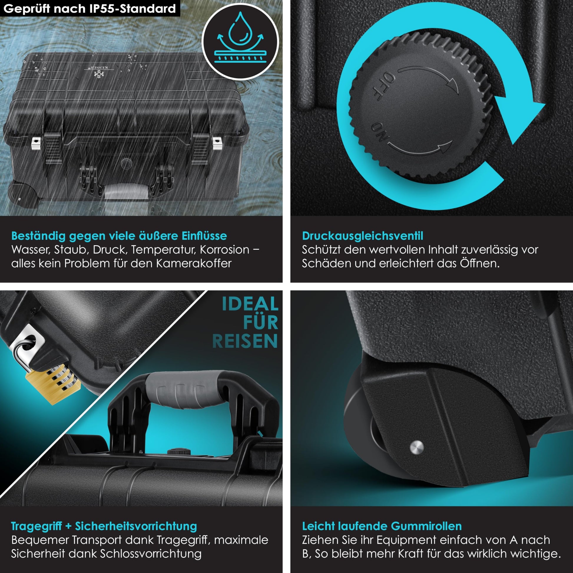 Der Koffer ist nach IP55-Standard zertifiziert. Das bedeutet, er ist staubgeschützt und bietet zuverlässigen Schutz vor Spritzwasser aus allen Richtungen. Eine umlaufende Dichtung und starke Schnappverschlüsse sorgen dafür, dass Ihre Ausrüstung auch bei Regen oder in staubiger Umgebung sauber und trocken bleibt.