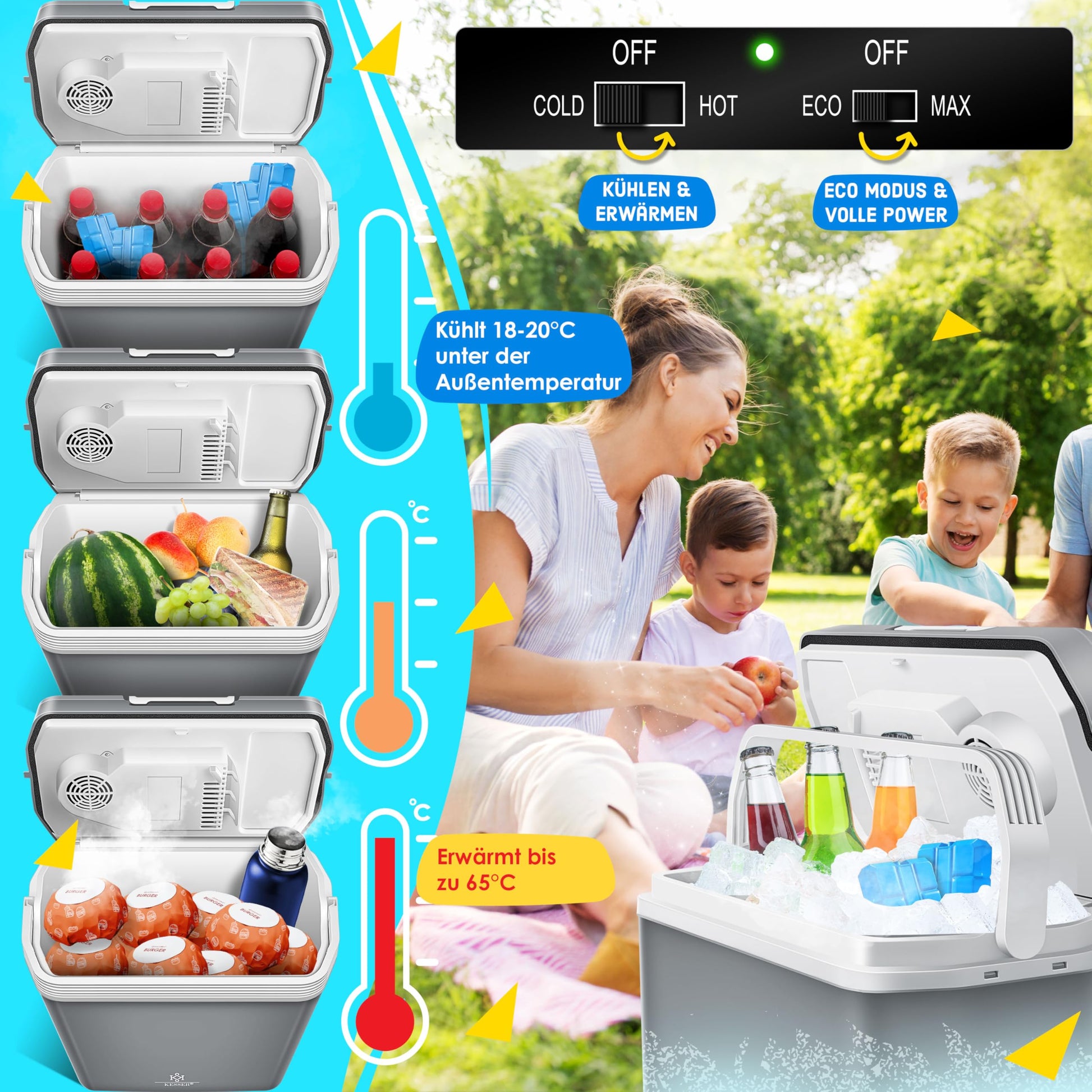 Ja, die Box verfügt über eine Doppelfunktion. Sie kann Getränke auf bis zu 18 °C unter die Umgebungstemperatur kühlen oder Speisen auf bis zu 65 °C erwärmen, was sie ideal für den ganzjährigen Einsatz macht.