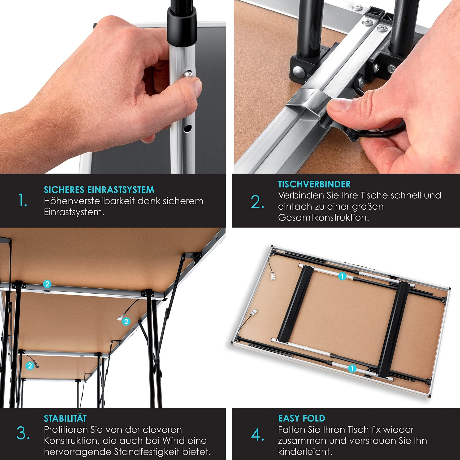 Sehr kompakt. Jeder Tisch verfügt über einen einfachen Klappmechanismus, mit dem er sich auf Koffergrösse zusammenfalten lässt. Dank des geringen Eigengewichts und integrierter Tragegriffe ist das Set äusserst mobil und kann mühelos transportiert und platzsparend im Auto, Keller oder Schuppen verstaut werden.