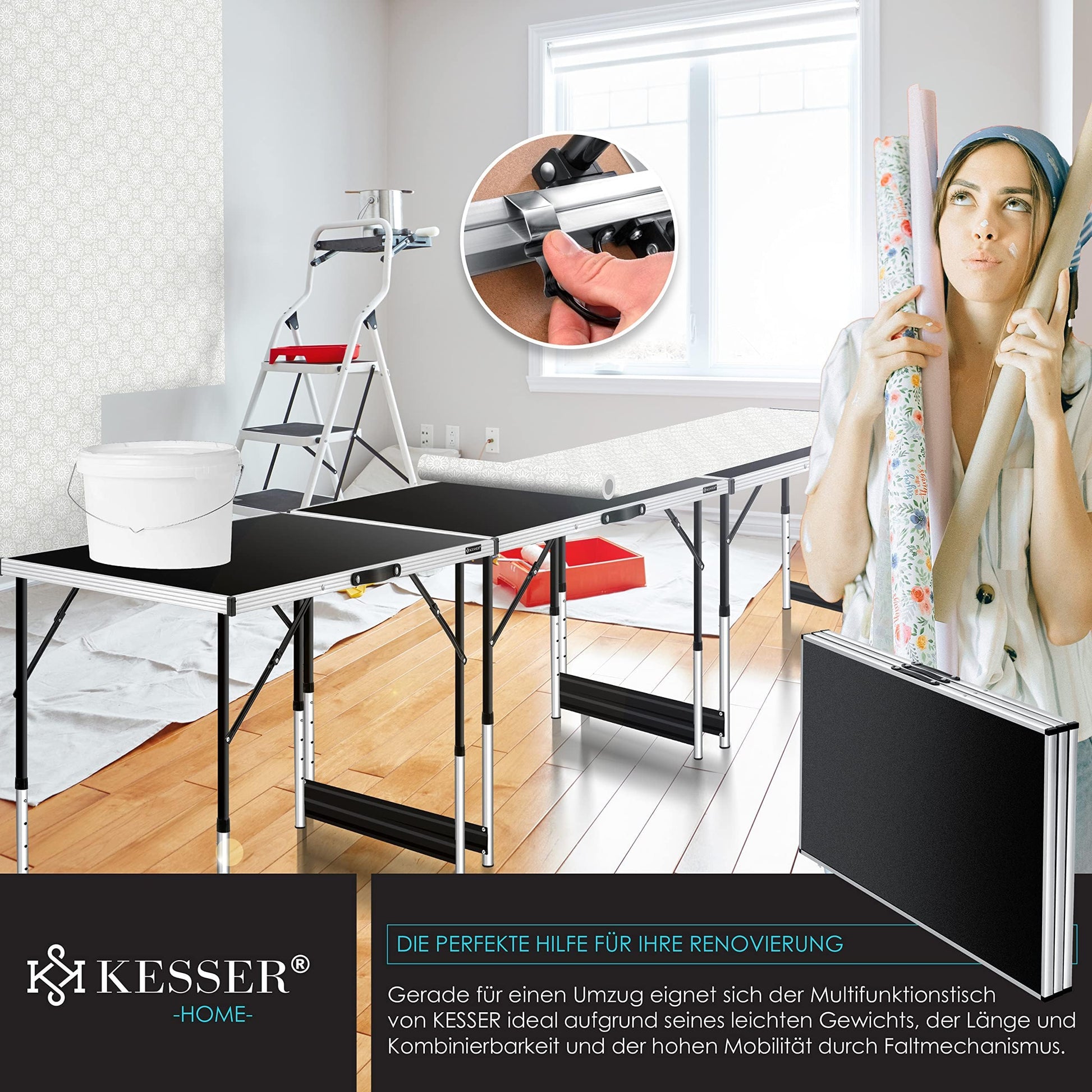 Komfortabel und platzsparend: Schonen Sie Ihren Rücken bei längeren Arbeiten wie dem Tapezieren, indem Sie die Tische auf die für Sie optimale Arbeitshöhe einstellen. Das sichere Einrastsystem sorgt dabei für maximale Stabilität. Nach dem Gebrauch lässt sich das Set dank des Faltmechanismus schnell und einfach zusammenklappen und platzsparend verstauen. Die pflegeleichte Oberfläche kann bei Verschmutzungen unkompliziert mit Wasser gereinigt werden.