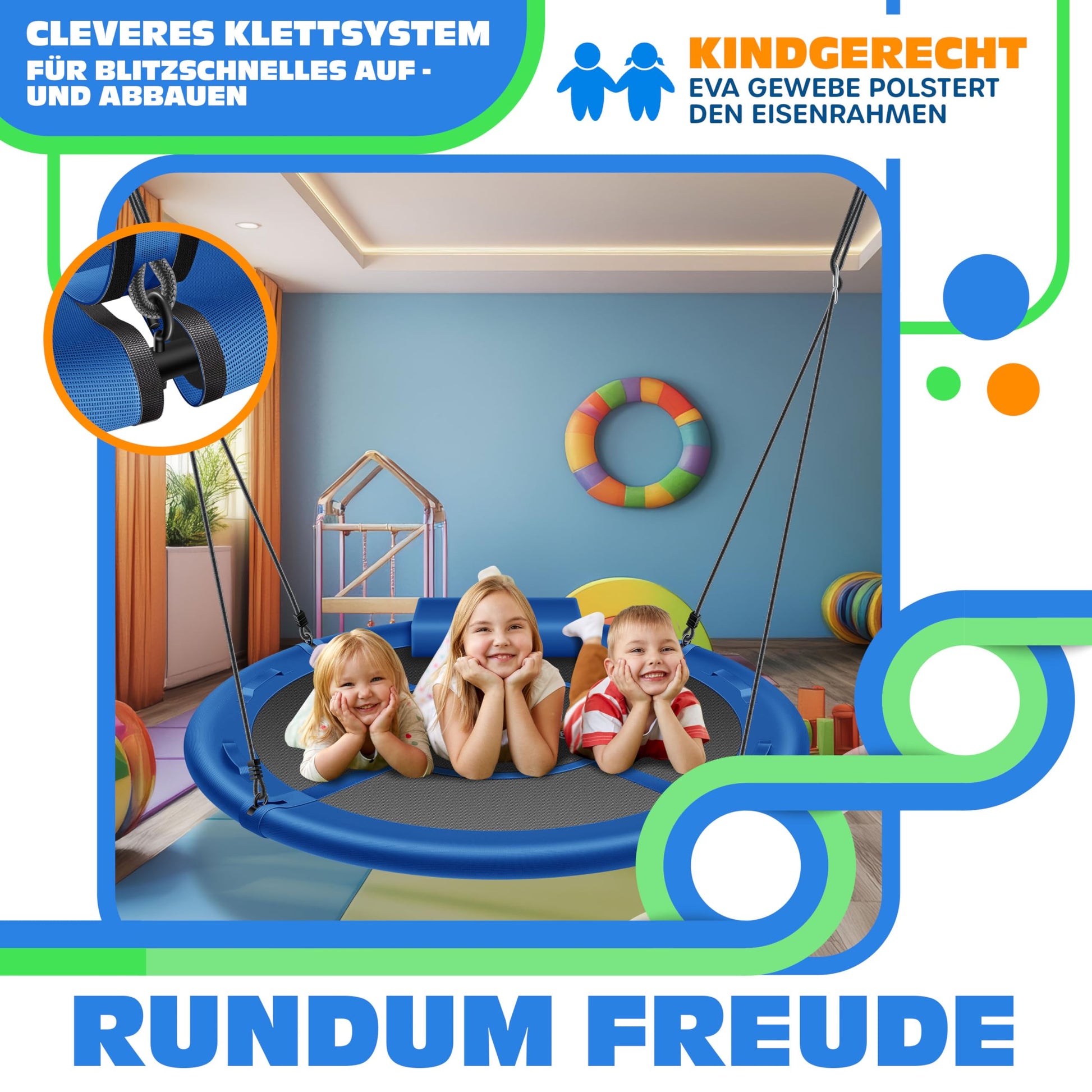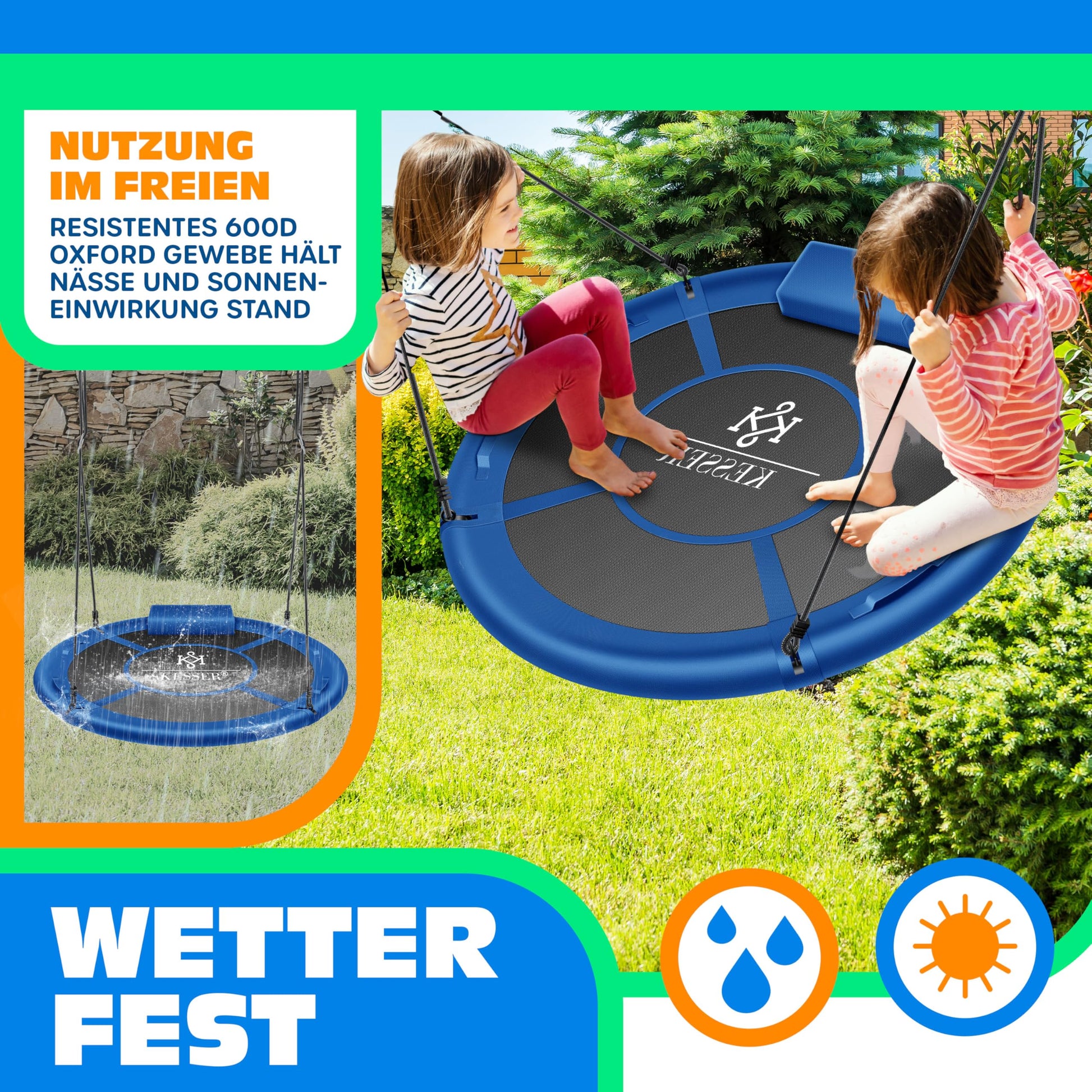 Die Nestschaukel ist für die ganze Familie konzipiert – ideal für mehrere Kinder oder auch Erwachsene. Dank ihrer robusten Konstruktion hat sie eine hohe Belastbarkeit von bis zu 300 kg und bietet auf der 120 cm grossen Sitzfläche bequem Platz für gemeinsamen Schaukelspass.