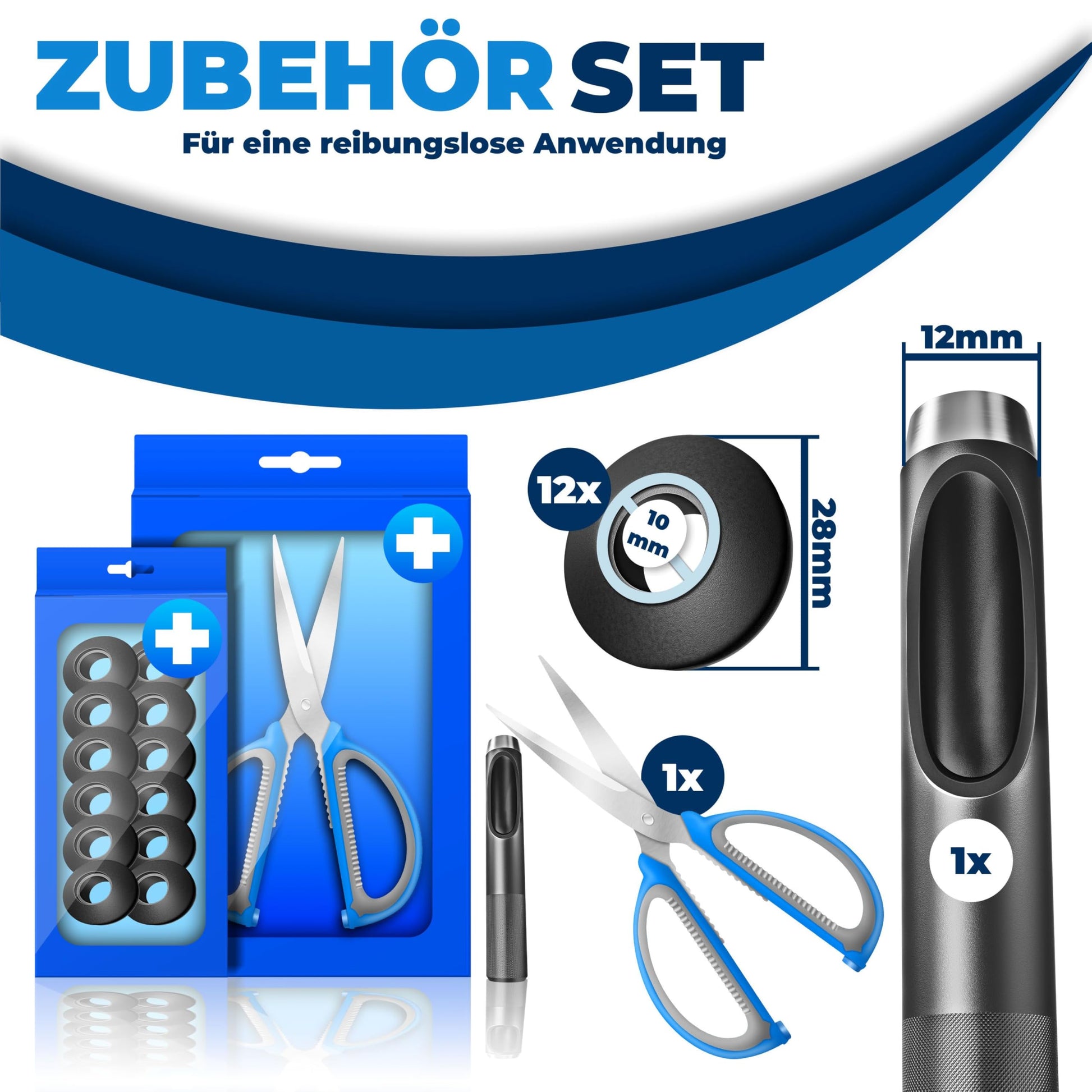 - Komplettes Set: Im Lieferumfang sind 1 Schere, 1 Lochzange und 12 Ösen für eine einfache Handhabung und Befestigung enthalten.
