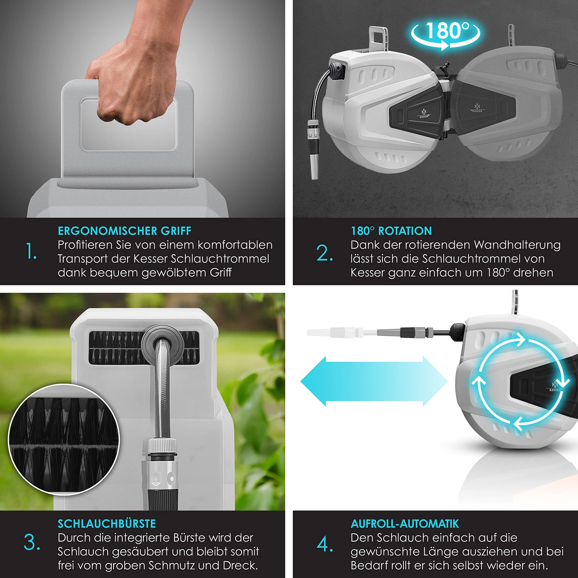 - Automatische Aufrollfunktion: Ein integrierter Mechanismus mit Fliehkraftbremse sorgt für ein kontrolliertes und selbstständiges Einziehen des 30 Meter langen Wasserschlauchs.