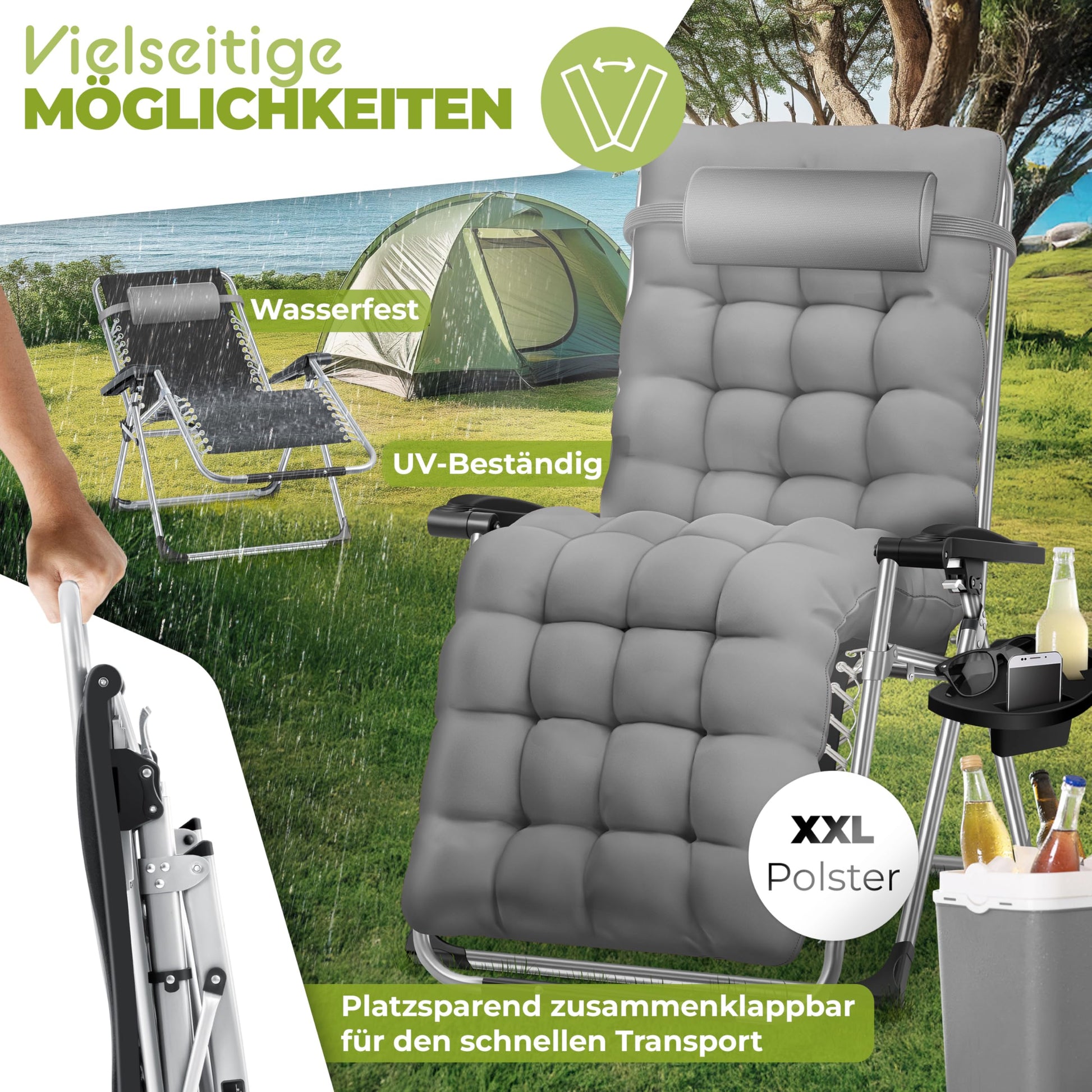 Die Sonnenliege wird als Komplettausstattung geliefert. Im Lieferumfang enthalten sind ein abnehmbares, weiches Komfortpolster für die gesamte Liegefläche, ein verstellbares Nackenkissen sowie ein praktischer seitlicher Halter für Getränke, Smartphone oder Tablet.