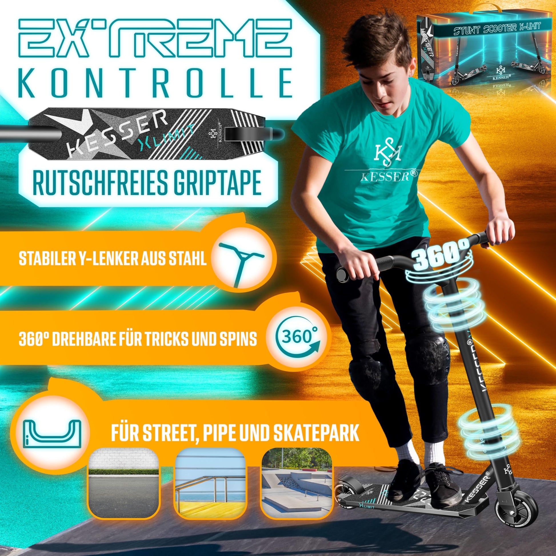 Der KESSER Stunt Scooter X-Limit ist der ideale Begleiter für alle, die im Skatepark oder auf der Strasse Action und Fahrspass suchen. Er kombiniert ein robustes Design mit agilen Fahreigenschaften für Anfänger und Fortgeschrittene gleichermassen.