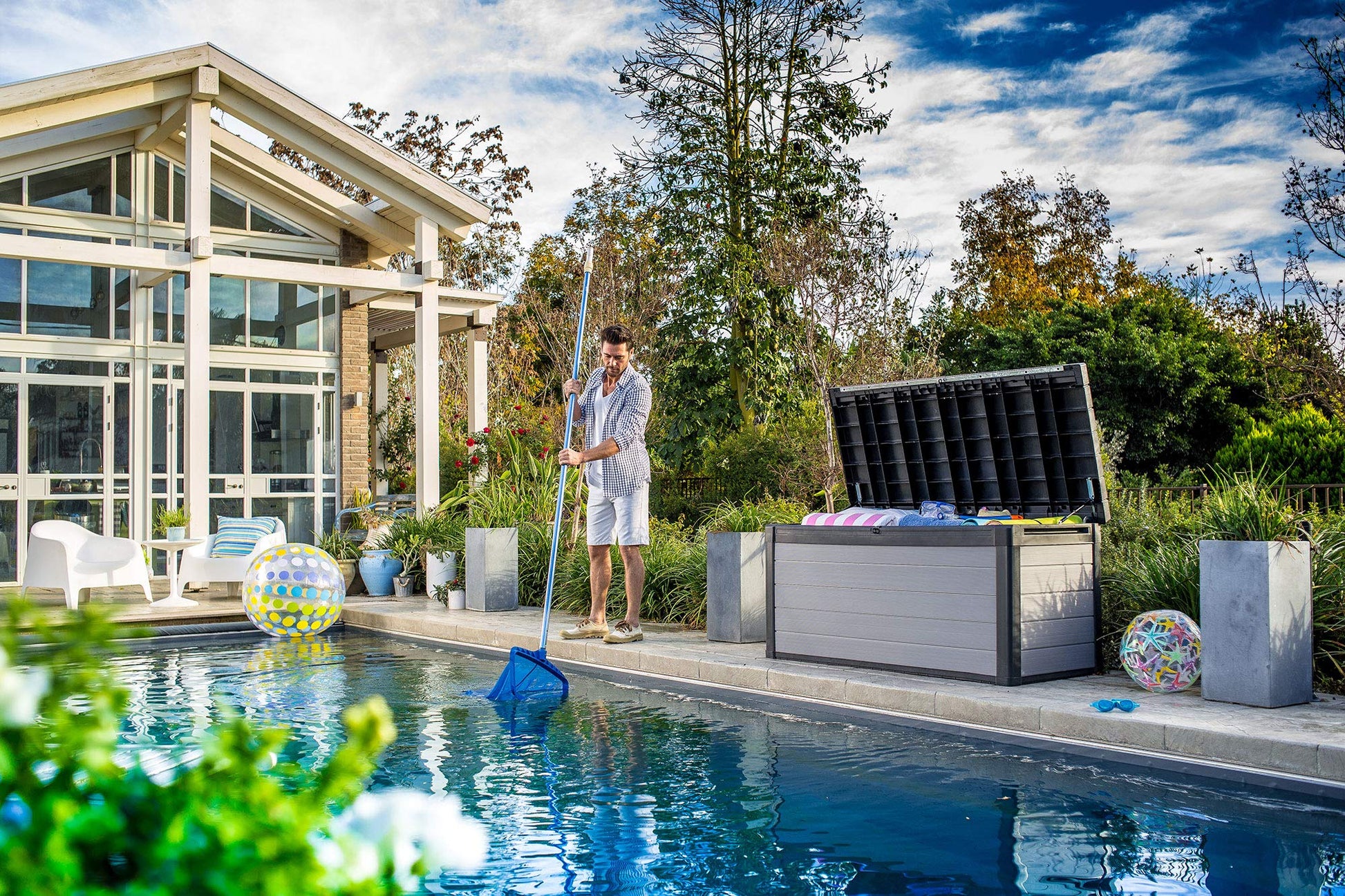Ja, für erhöhte Sicherheit kann die Box mit einem handelsüblichen Vorhängeschloss (nicht im Lieferumfang) abgeschlossen werden. Das langlebige Polypropylen ist sehr pflegeleicht und lässt sich einfach mit Wasser und einem milden Reinigungsmittel reinigen, was die Box zu einer wartungsarmen Lösung für jeden Aussenbereich macht.