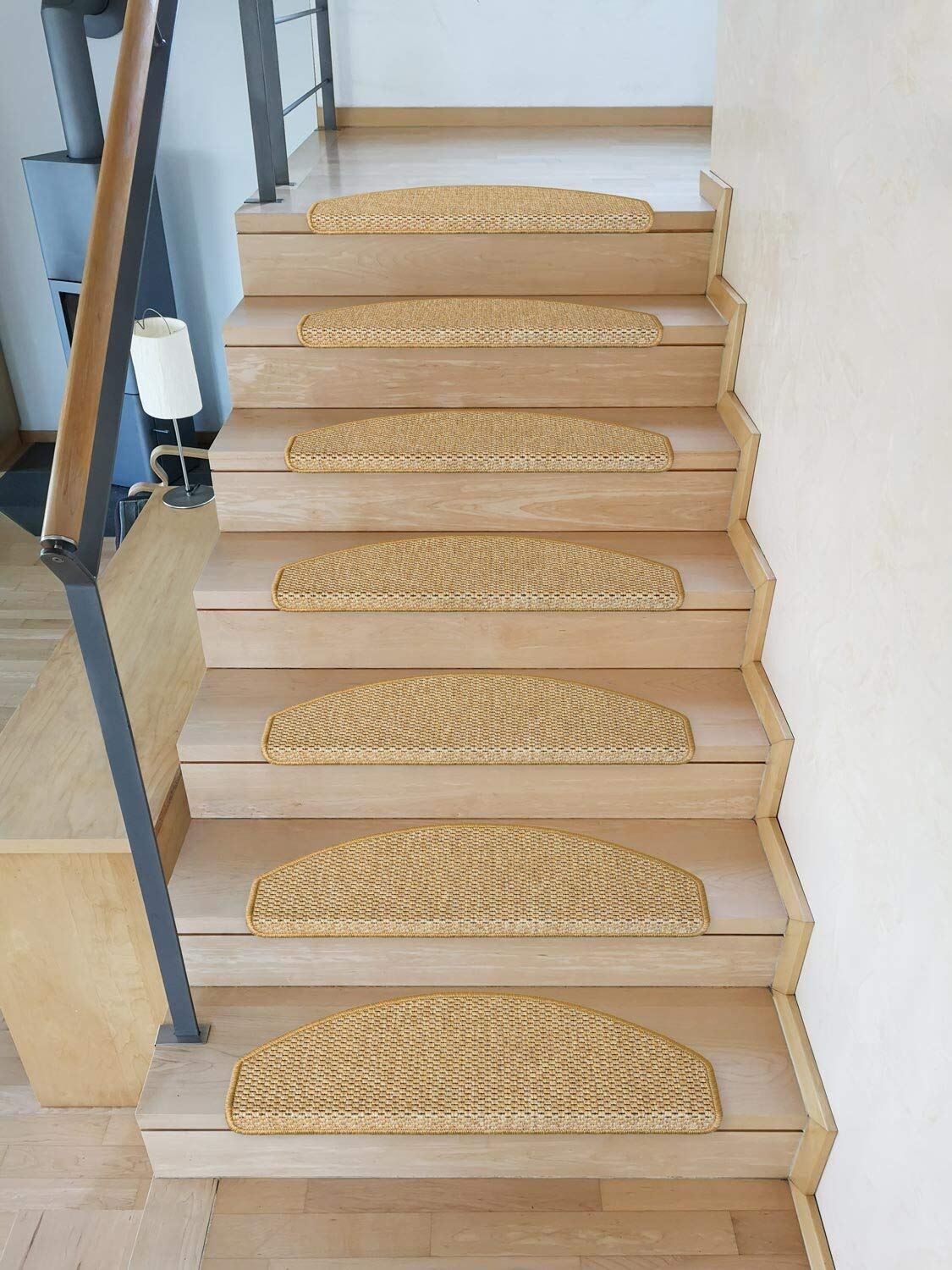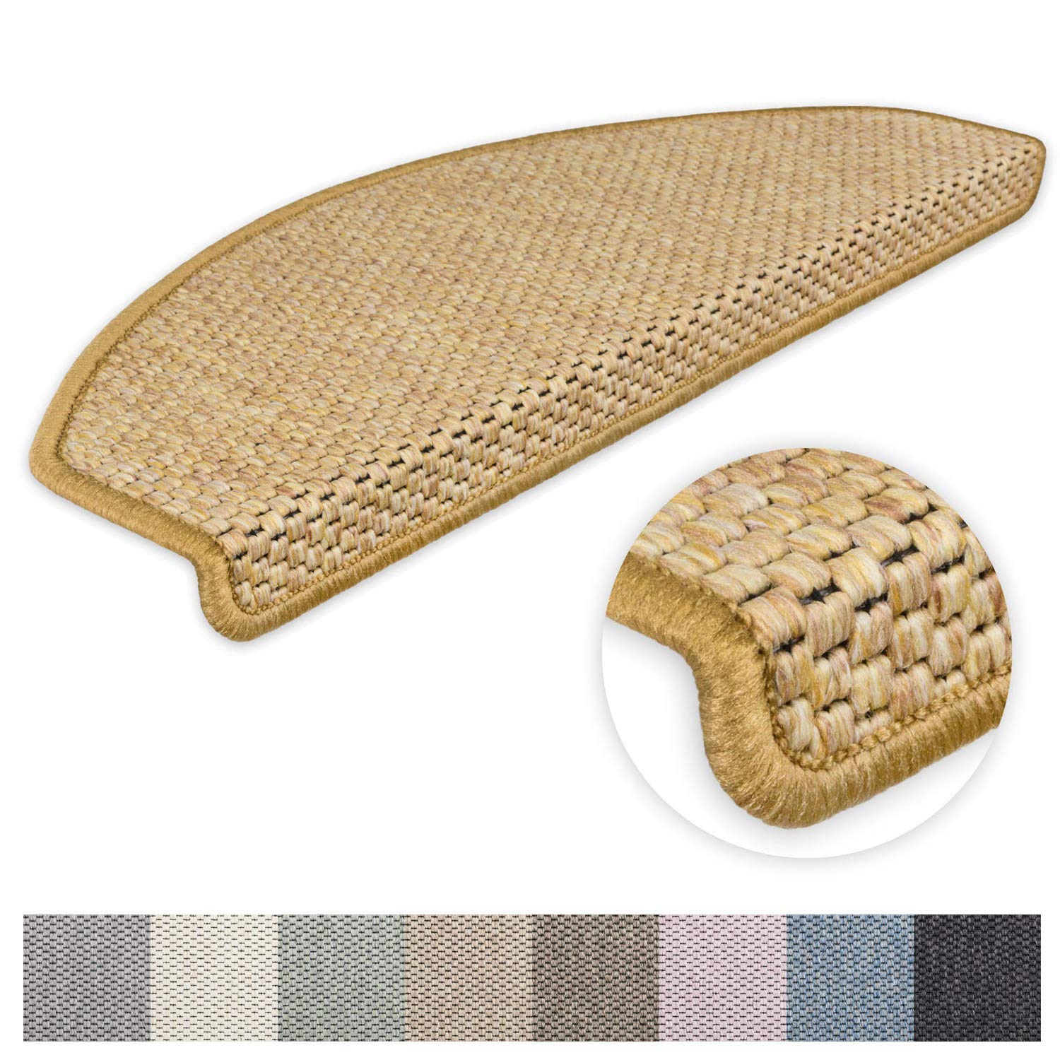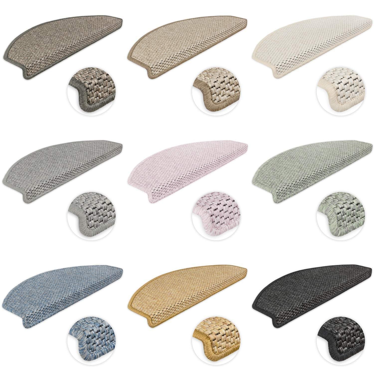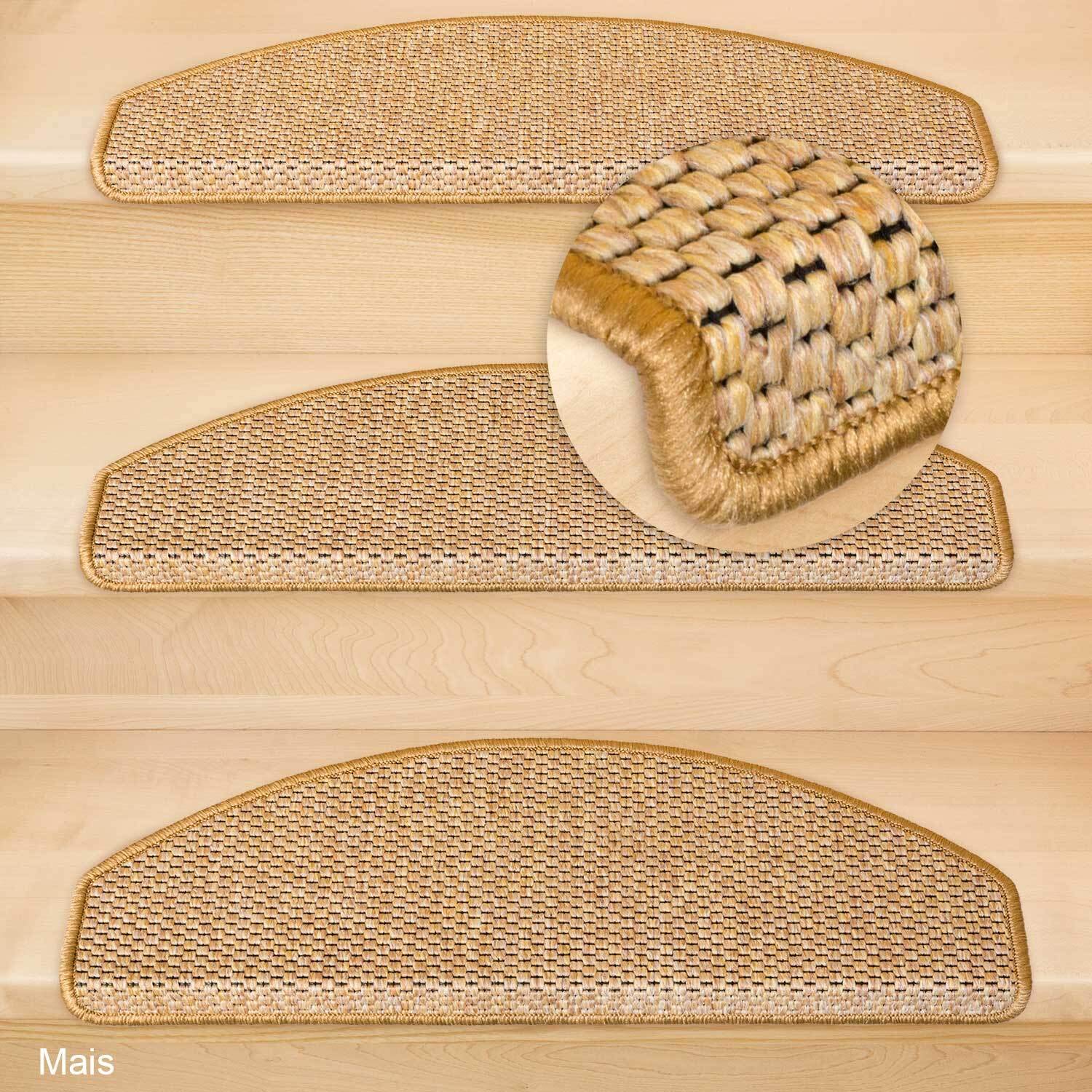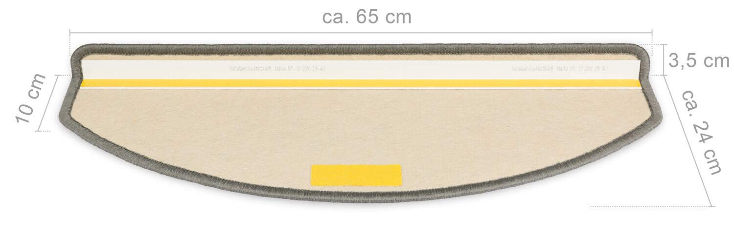 Die Matten sind halbrund und haben eine Trittfläche von ca. 65 x 24 cm mit einer 4 cm hohen Vorderkante. Dieses Set beinhaltet 15 Stufenmatten, passend für die meisten gängigen Treppen.