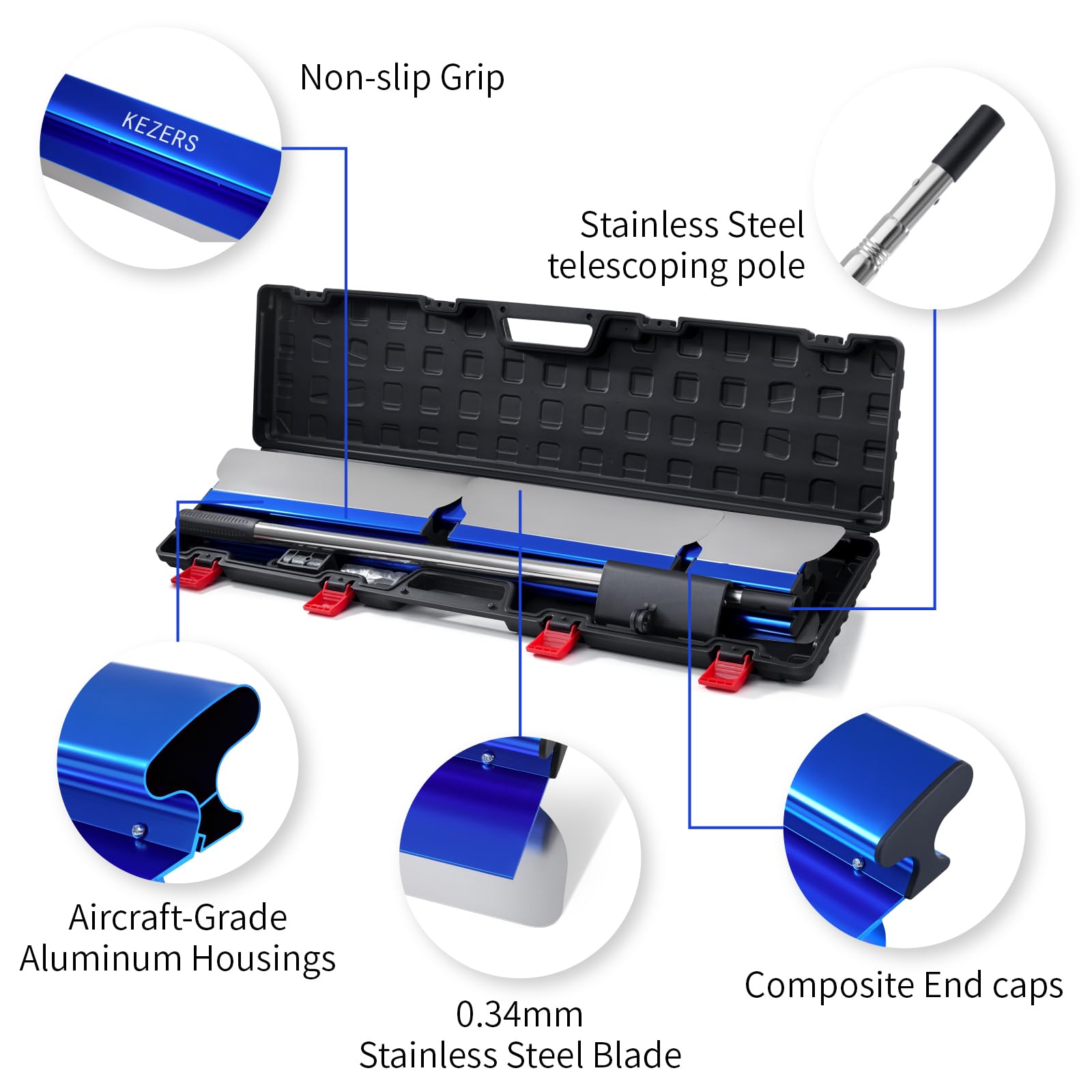 - Hochwertige Materialien: Die Spachtel bestehen aus einem leichten, blau lackierten Aluminiumgehäuse in Luftfahrt-Qualität und rostfreien Edelstahlklingen, die ein müheloses Verteilen der Spachtelmasse ermöglichen.