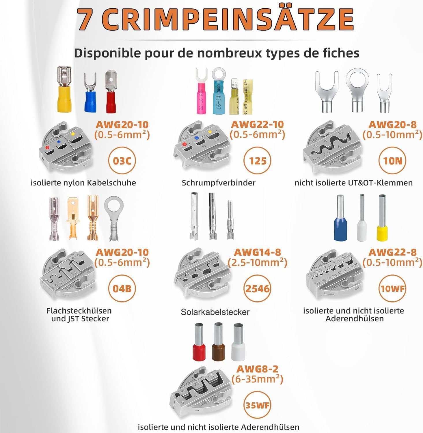 Dieses Set ist extrem vielseitig und deckt fast alle gängigen elektrischen Verbindungsarbeiten ab. Mit den 7 Spezialbacken können Sie isolierte und nicht isolierte Kabelschuhe, Aderendhülsen, Schrumpfverbinder sowie Solarstecker professionell verpressen.