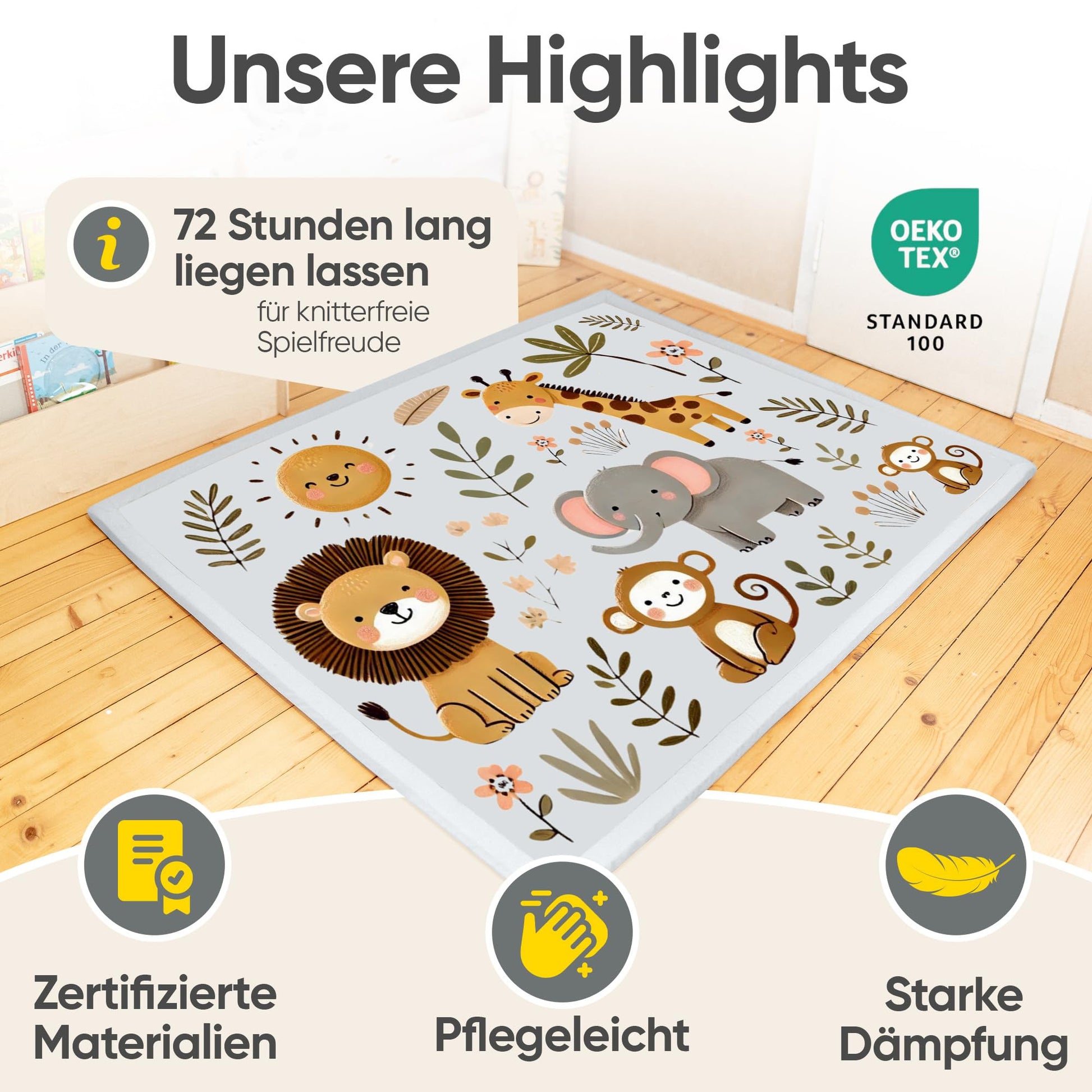 Neben dem hohen Sicherheitsstandard ist die Matte auch ein praktischer und schöner Alltagsbegleiter. Sie wertet jedes Kinderzimmer optisch auf und lässt sich bei Bedarf mühelos reinigen, was Ihnen wertvolle Zeit spart.