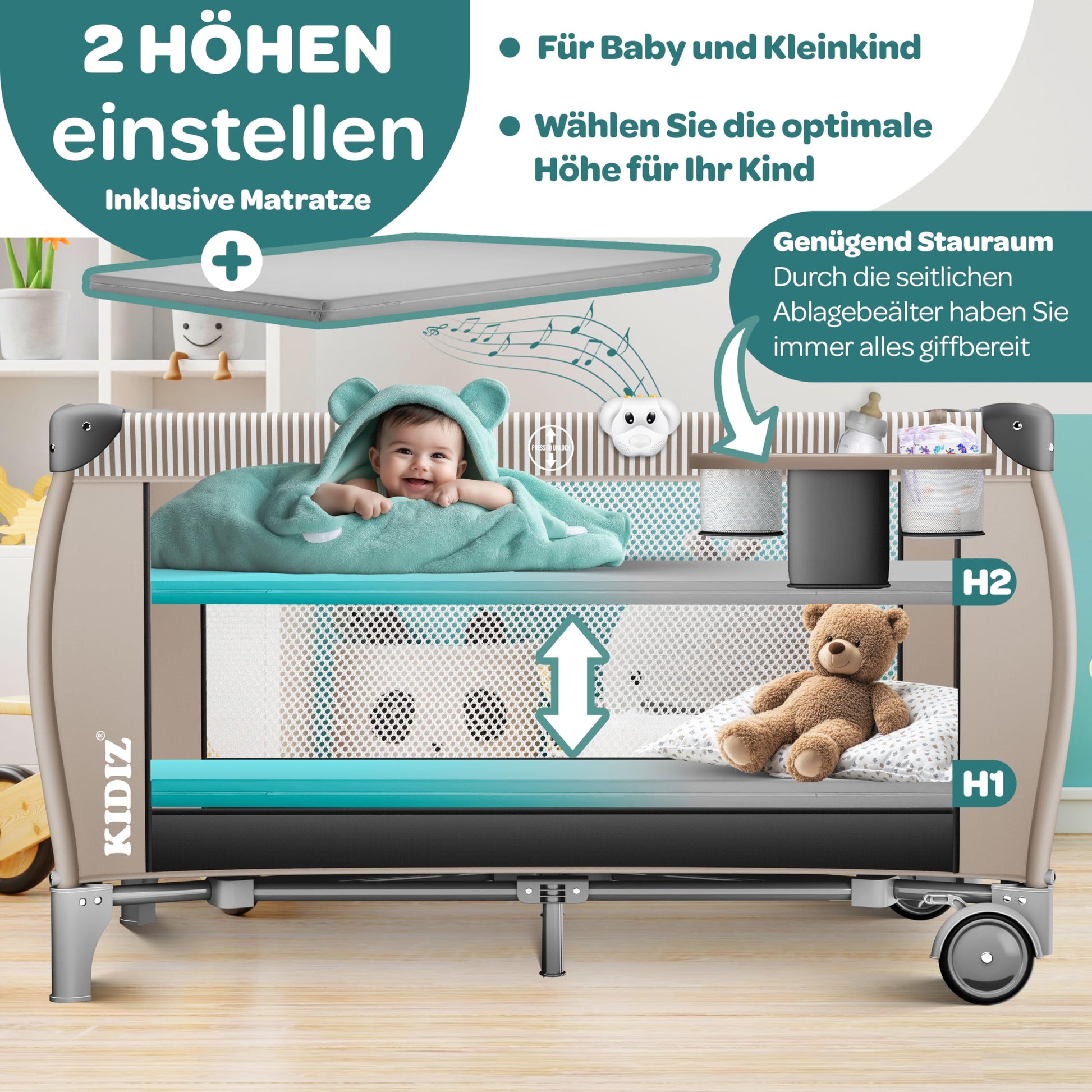 - Höhenverstellbare Liegefläche: Zwei Ebenen passen sich dem Alter und der Grösse Ihres Kindes optimal an.
