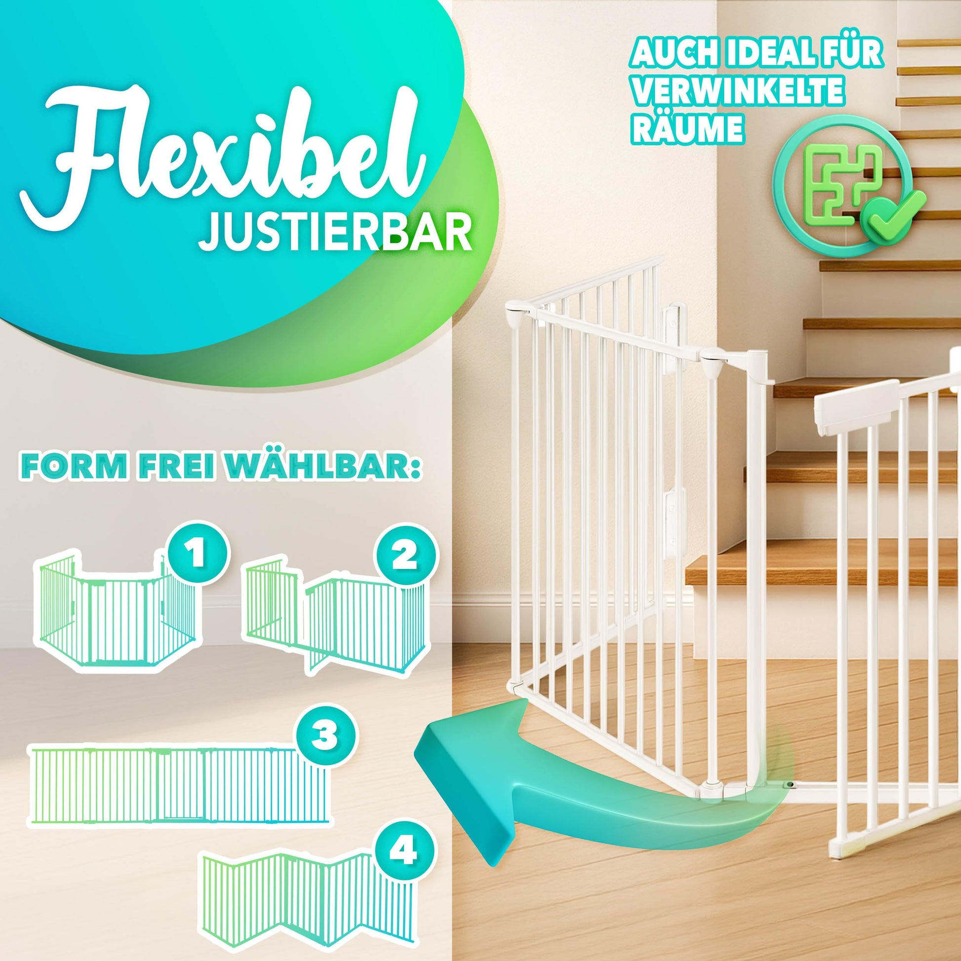 Das Gitter ist mit seiner Gesamtlänge von 300 cm und den fünf flexiblen Elementen äusserst vielseitig. Sie können es als Kaminschutzgitter, Treppenschutzgitter für breite Durchgänge oder als praktischen Raumteiler einsetzen, um Ihre Liebsten zuverlässig vor Gefahren zu schützen.