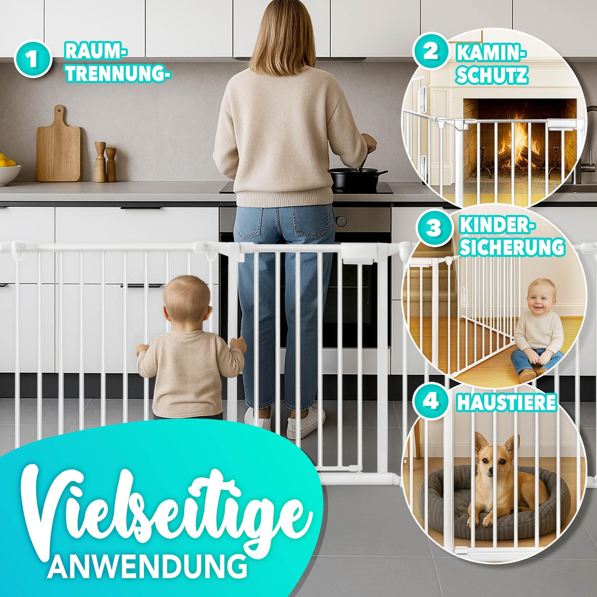 Höchste Sicherheit für Ihr Kind: Der spezielle Schliessmechanismus der Tür verhindert, dass Kleinkinder das Gitter selbstständig öffnen können. So können Sie beruhigt sein, dass Ihr Kind vor heissen Cheminées, ungesicherten Treppen oder anderen Gefahrenbereichen geschützt ist.