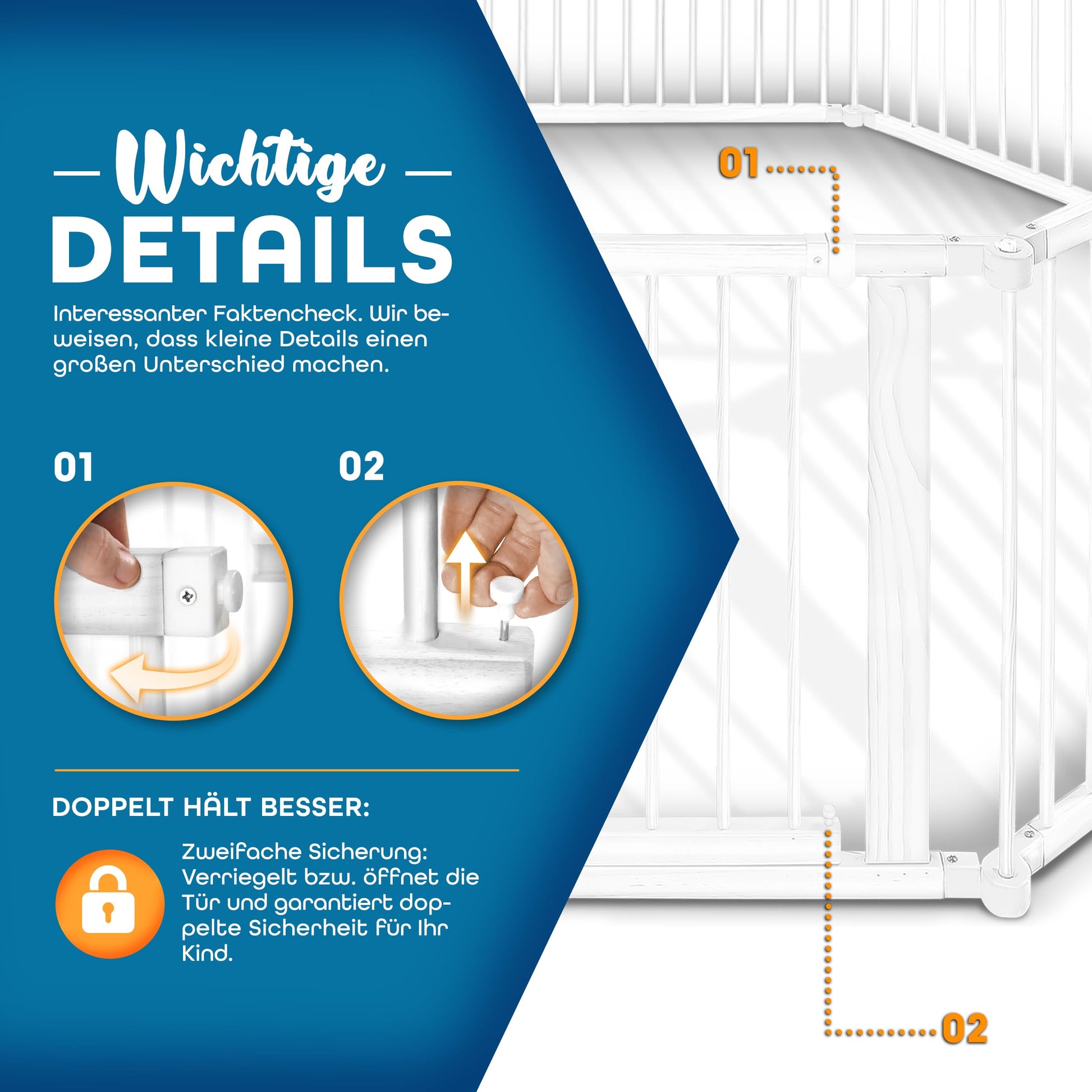 Für maximale Sicherheit sorgen mehrere Merkmale: eine doppelte Türsicherung, die Kinder nicht selbst öffnen können, rutschfeste Standfüsse für hohe Stabilität, sorgfältig geschliffene Oberflächen ohne scharfe Kanten und ein Gitterstab-Abstand von ca. 6,5 cm. Die Höhe von 70 cm bietet eine sichere Barriere.