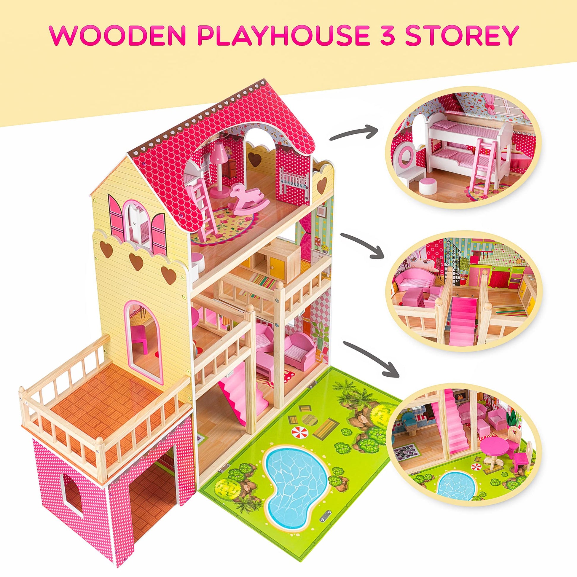 Dieses grosszügige, dreistöckige Puppenhaus aus Holz ist ein Traum für jedes Kinderzimmer und bietet auf 90 cm Höhe unzählige Spielmöglichkeiten. Es wird zum Mittelpunkt fantasievoller Geschichten und kreativer Rollenspiele.