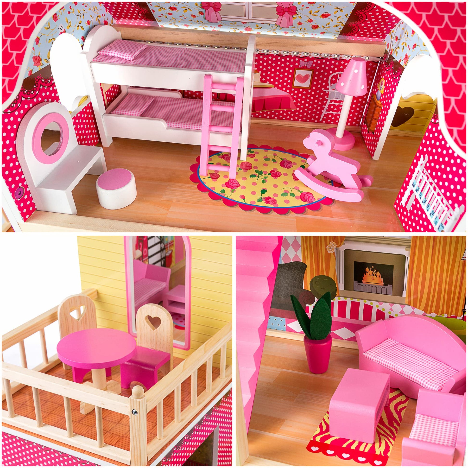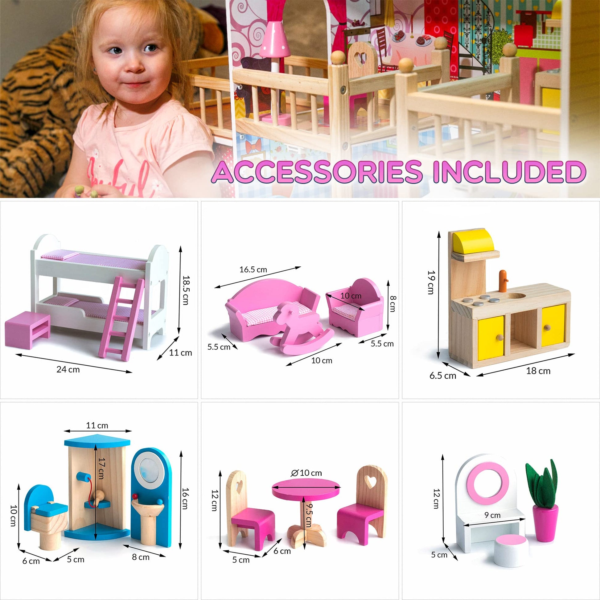 - Komplette Möblierung: Das 17-teilige Möbel-Set aus Holz umfasst alles von der Küchenzeile über ein Etagenbett bis zum Schaukelpferd, damit der Spielspass sofort beginnen kann.
