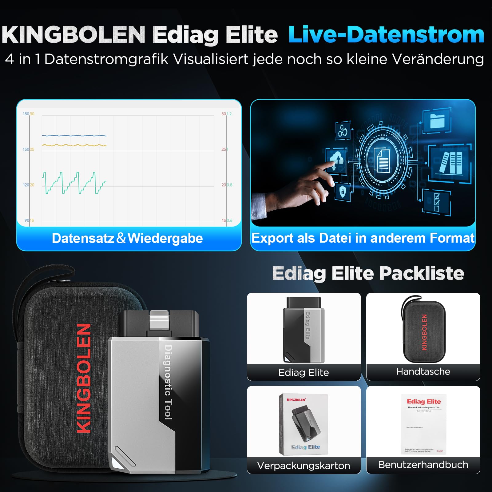 Das KINGBOLEN EDIAG Elite ist ein modernes, kabelloses Diagnosegerät, das Ihr Smartphone in ein leistungsstarkes Werkzeug für umfassende Fahrzeuganalysen und Wartungsarbeiten verwandelt.