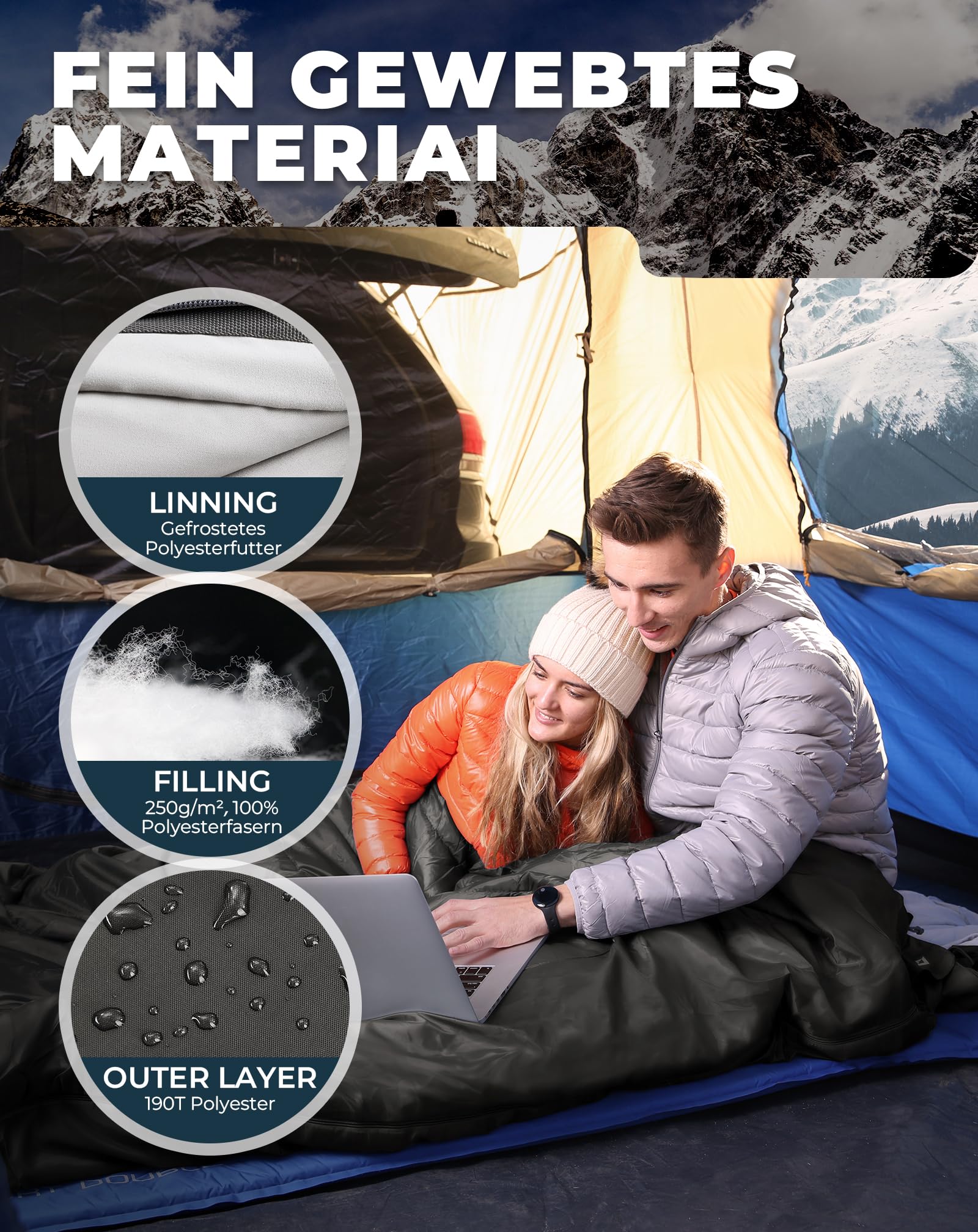 - Flexible Nutzung: Mit einer grosszügigen Liegefläche von 220 × 150 cm bietet der Schlafsack reichlich Platz für zwei. Er kann zudem einfach in zwei separate Einzelschlafsäcke getrennt oder vollständig geöffnet als grosse Decke verwendet werden.