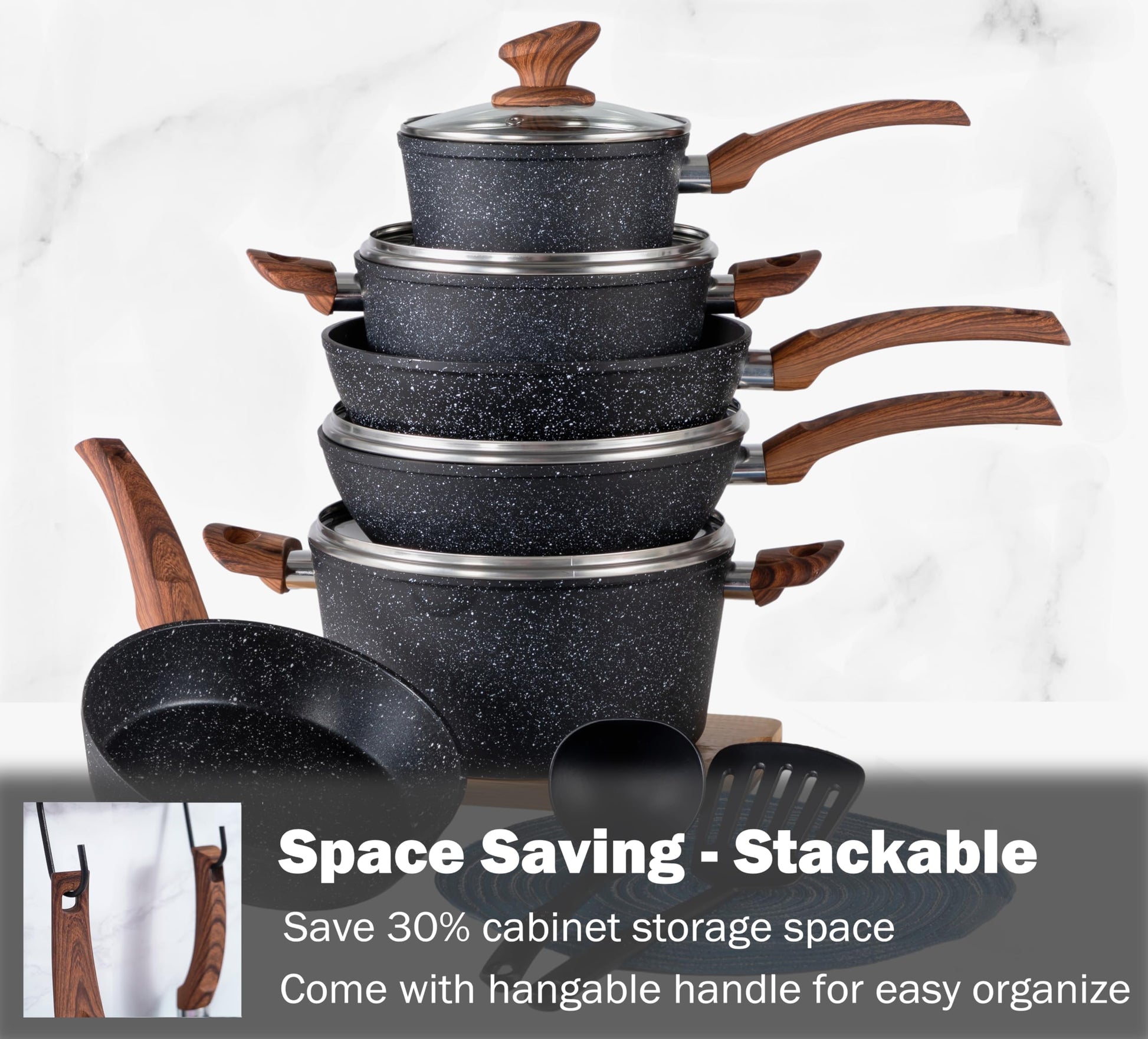 Statten Sie Ihre Küche komplett neu aus mit diesem 12-teiligen Kochtopf-Set von Kitchen Academy. Es kombiniert ein modernes Design in schwarzer Granit-Optik mit hoher Funktionalität für den täglichen Gebrauch.