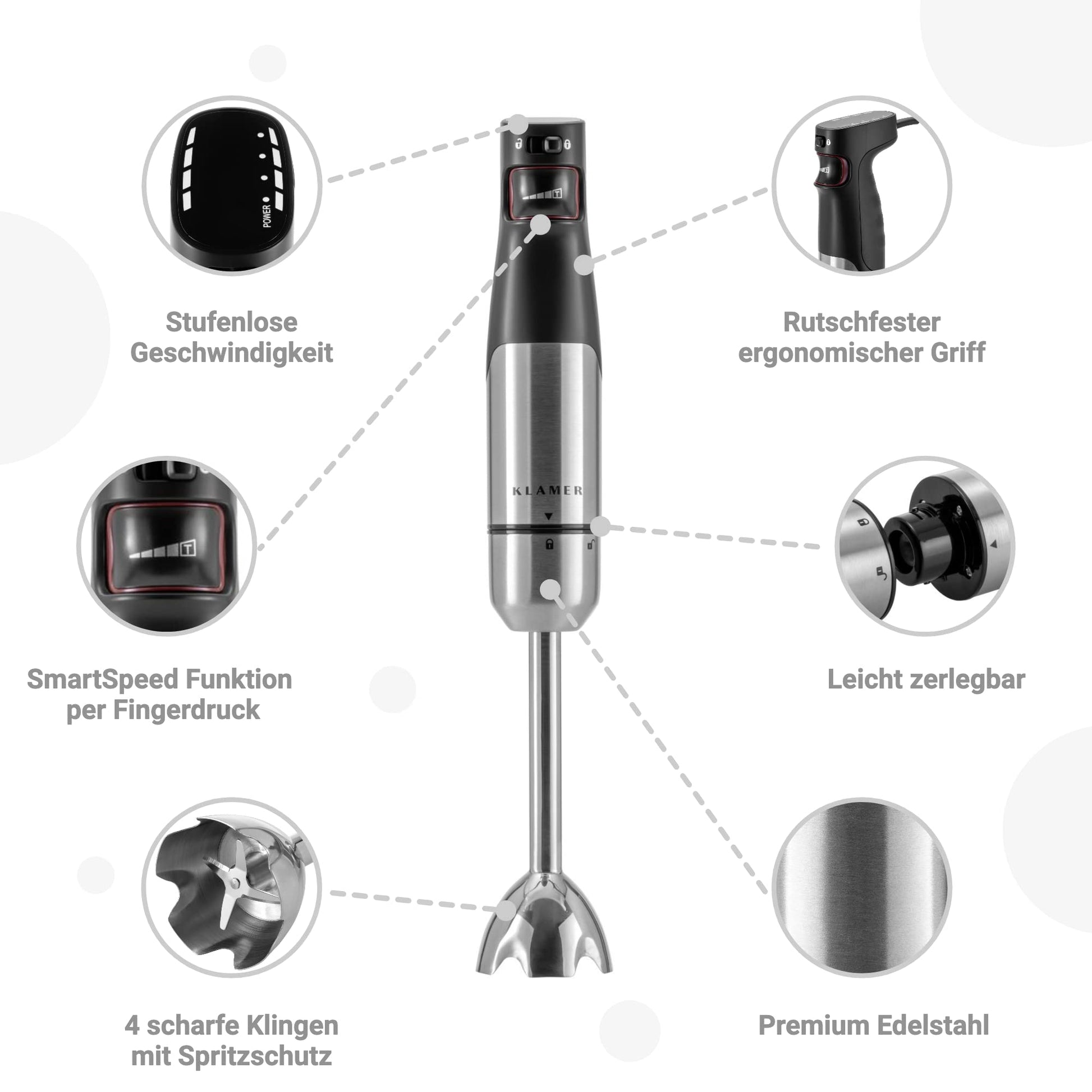 KLAMER Stabmixer Set 4-in-1 Pürierstab - 1000W Edelstahl