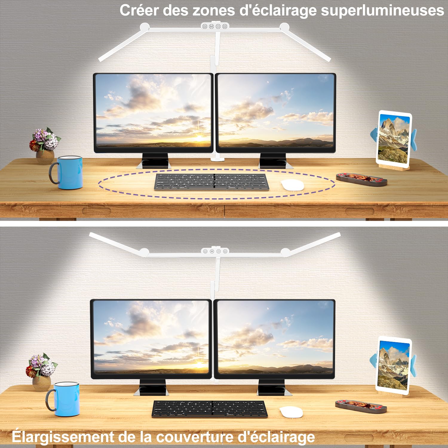 Ja, absolut. Mit einer ausziehbaren Reichweite von bis zu 72 cm und 7 flexiblen Gelenken leuchtet sie mühelos grosse Arbeitsflächen und Multi-Monitor-Setups aus. Die stabile Metallklemme kann platzsparend am Rand oder zwischen den Monitoren befestigt werden.