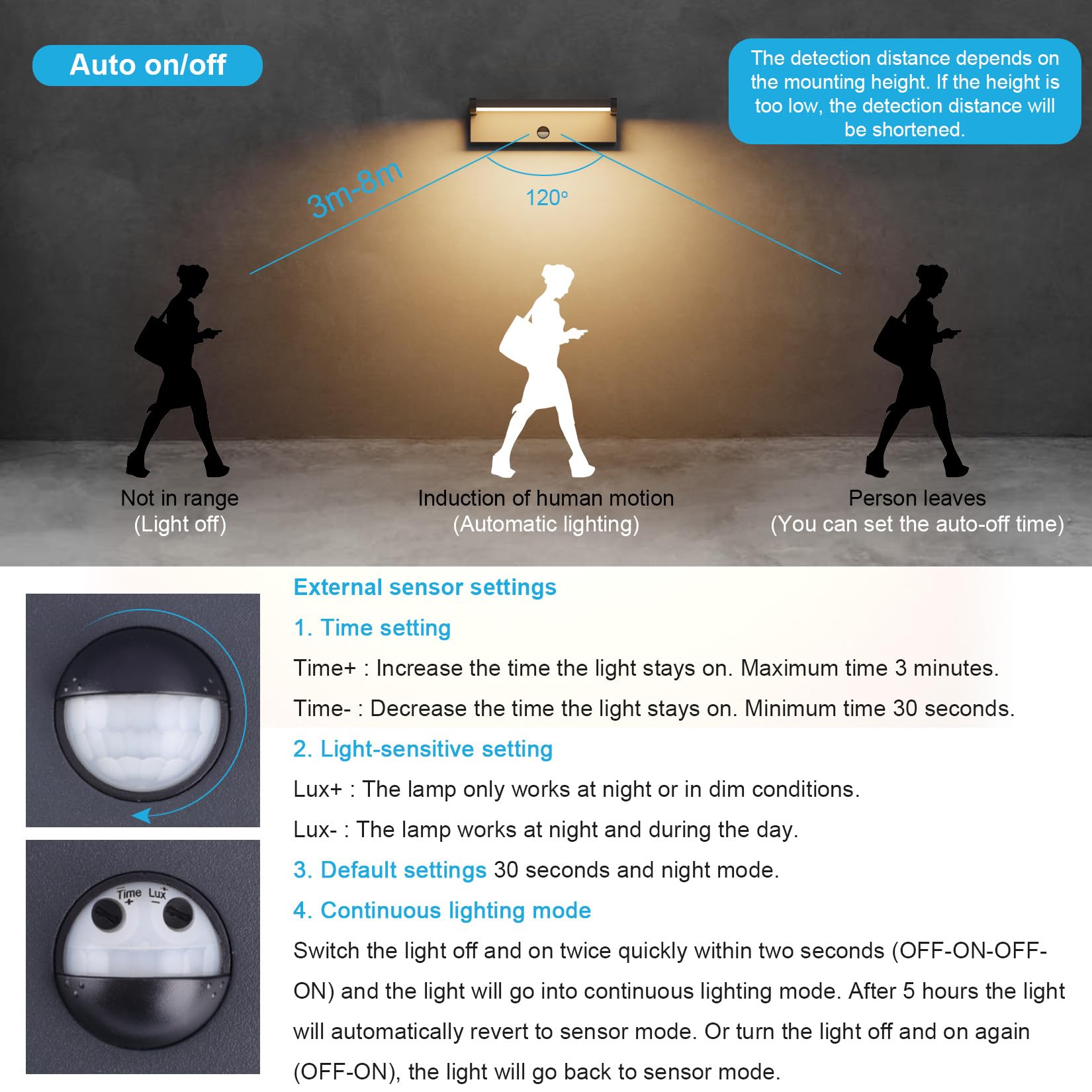 Sie können den Sensor präzise an Ihre Bedürfnisse anpassen. Es gibt Einstellmöglichkeiten für die Leuchtdauer nach der letzten Bewegung (30 Sekunden bis 3 Minuten), die Empfindlichkeit (Erfassungsbereich von 3 bis 8 Metern) und den Betriebsmodus (nur bei Dunkelheit oder 24/7 aktiv).