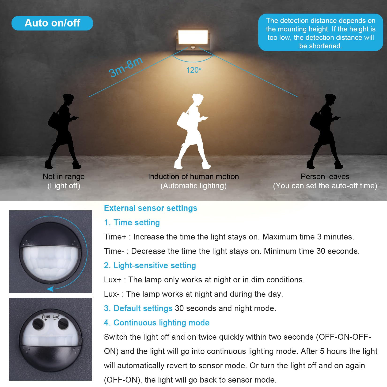 Der intelligente Sensor lässt sich individuell anpassen. Sie können die Leuchtdauer nach einer erkannten Bewegung zwischen 30 Sekunden und 3 Minuten einstellen. Zudem können Sie wählen, ob die Lampe nur nachts oder auch tagsüber auf Bewegung reagieren soll.