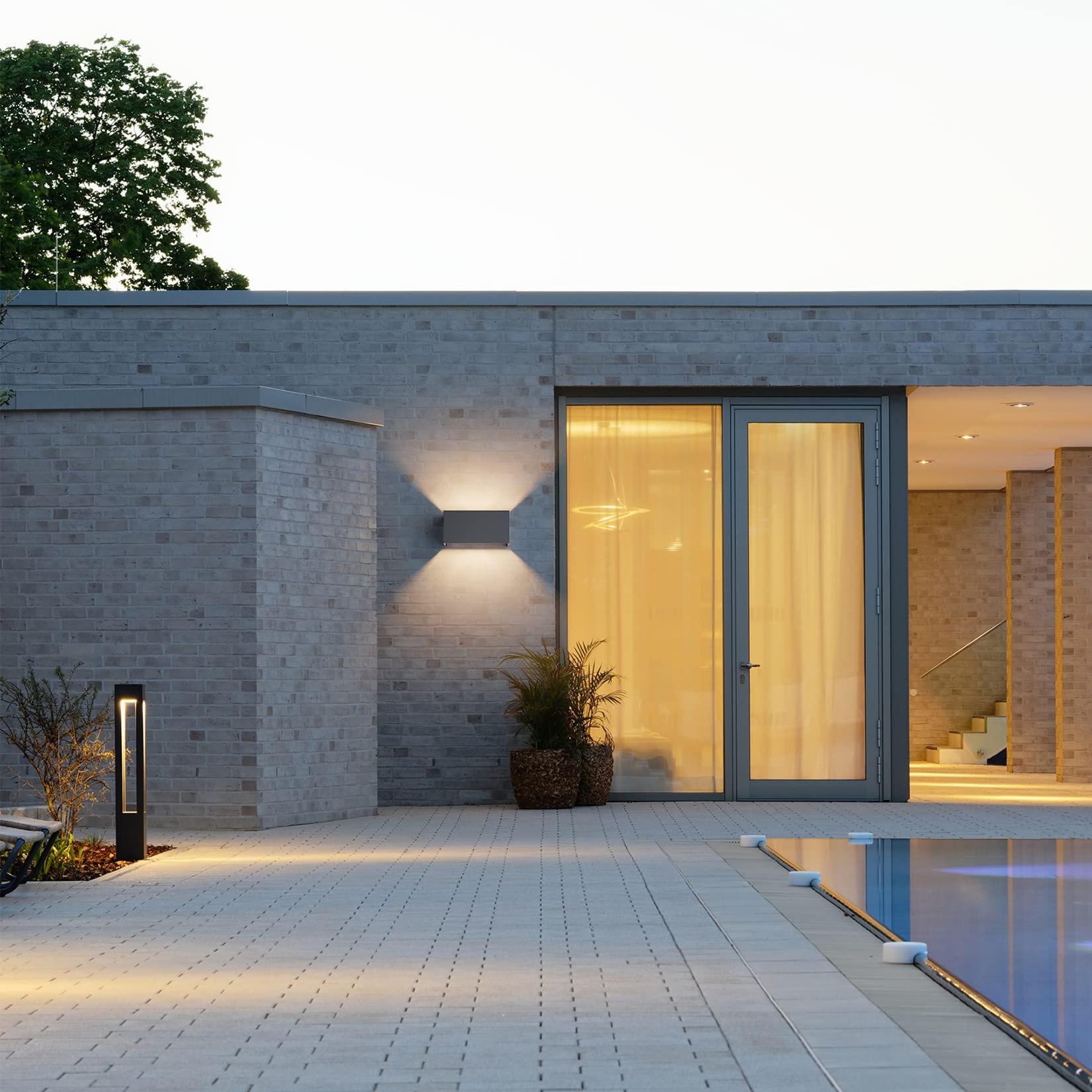 Die Wandleuchten sind aus hochwertigem, rostfreiem Aluminium gefertigt und in einem modernen Anthrazit-Farbton gehalten. Die Bauweise ist robust und explizit als wasserdicht beschrieben, wodurch sie für alle Wetterbedingungen im Aussenbereich bestens gerüstet sind.