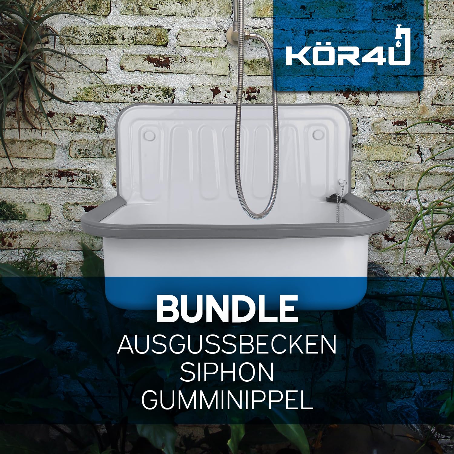 Das Set beinhaltet das 50 cm breite Ausgussbecken aus Stahl-Emaille, einen passenden Kunststoff-Siphon (1 1/2 Zoll x 40 mm) mit Geruchsverschluss, einen Abflussstopfen und einen Gumminippel (DN 40/50) für den Anschluss an das Abflussrohr.