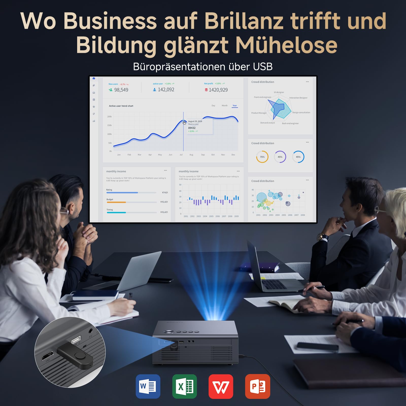 Dieser Beamer ist mehr als nur ein Unterhaltungsgerät. Dank der Unterstützung von Office-Programmen wie PPT oder Excel eignet er sich auch hervorragend für Geschäftstreffen und Präsentationen. Die schnelle Wi-Fi-6-Verbindung und die reaktionsschnelle Bluetooth-Fernbedienung gewährleisten dabei stets eine einfache und zuverlässige Bedienung.