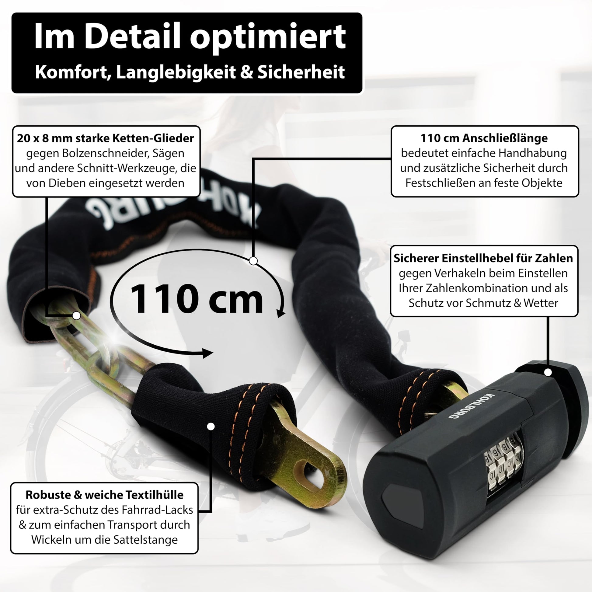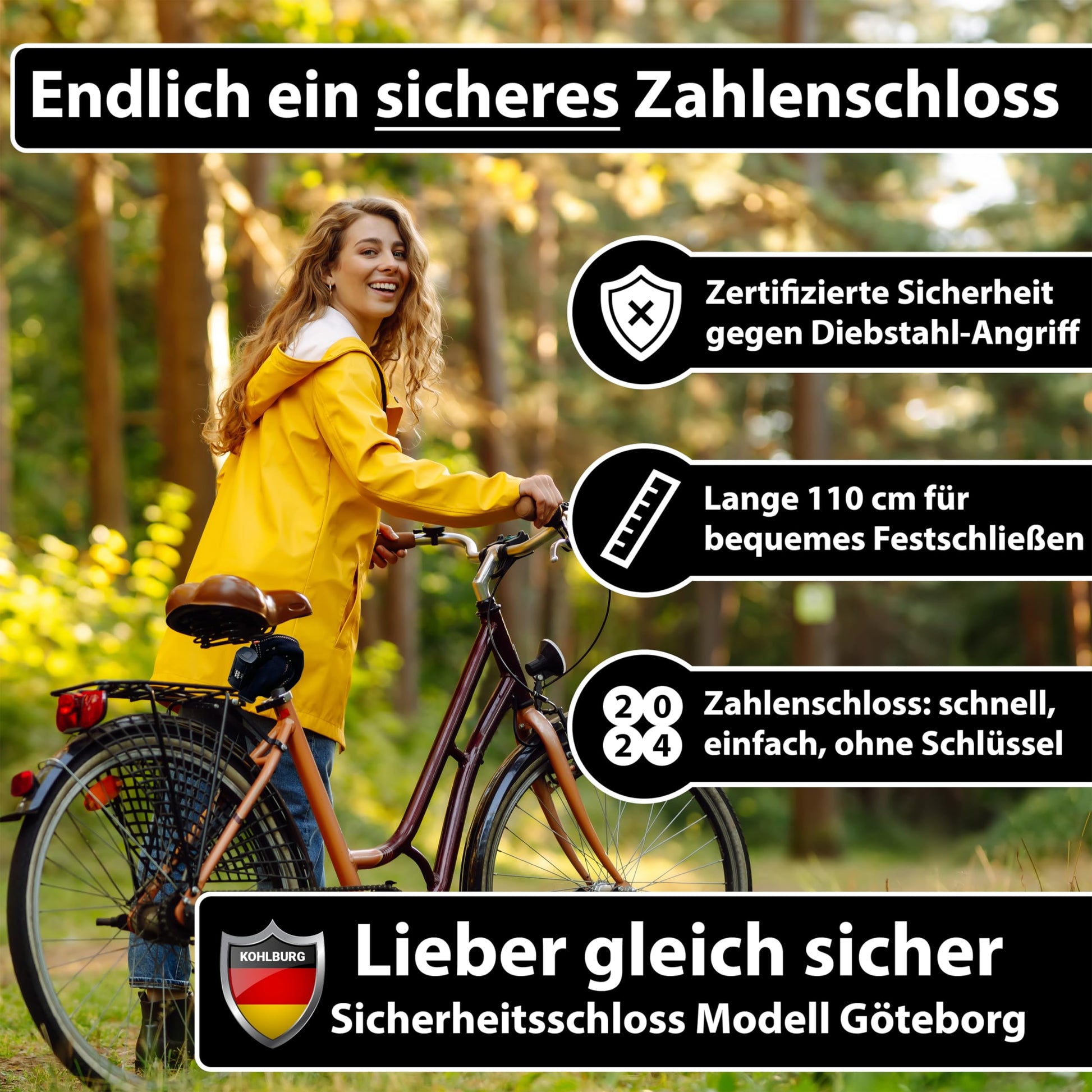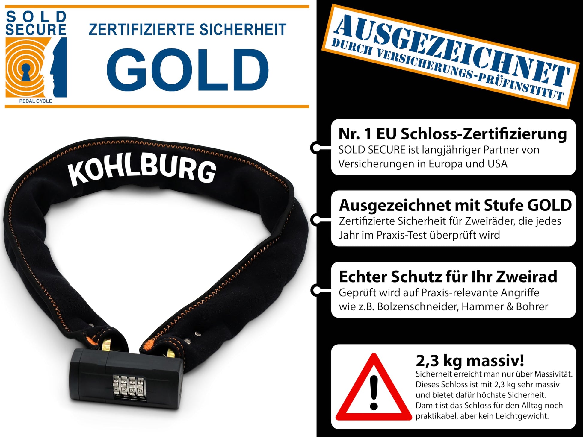 Das KOHLBURG Kettenschloss Modell Göteborg bietet kompromisslosen Diebstahlschutz für Ihr Velo oder Motorrad, kombiniert mit dem praktischen Komfort eines Zahlenschlosses. Sichern Sie Ihr Eigentum mit zertifizierter, massiver Qualität.