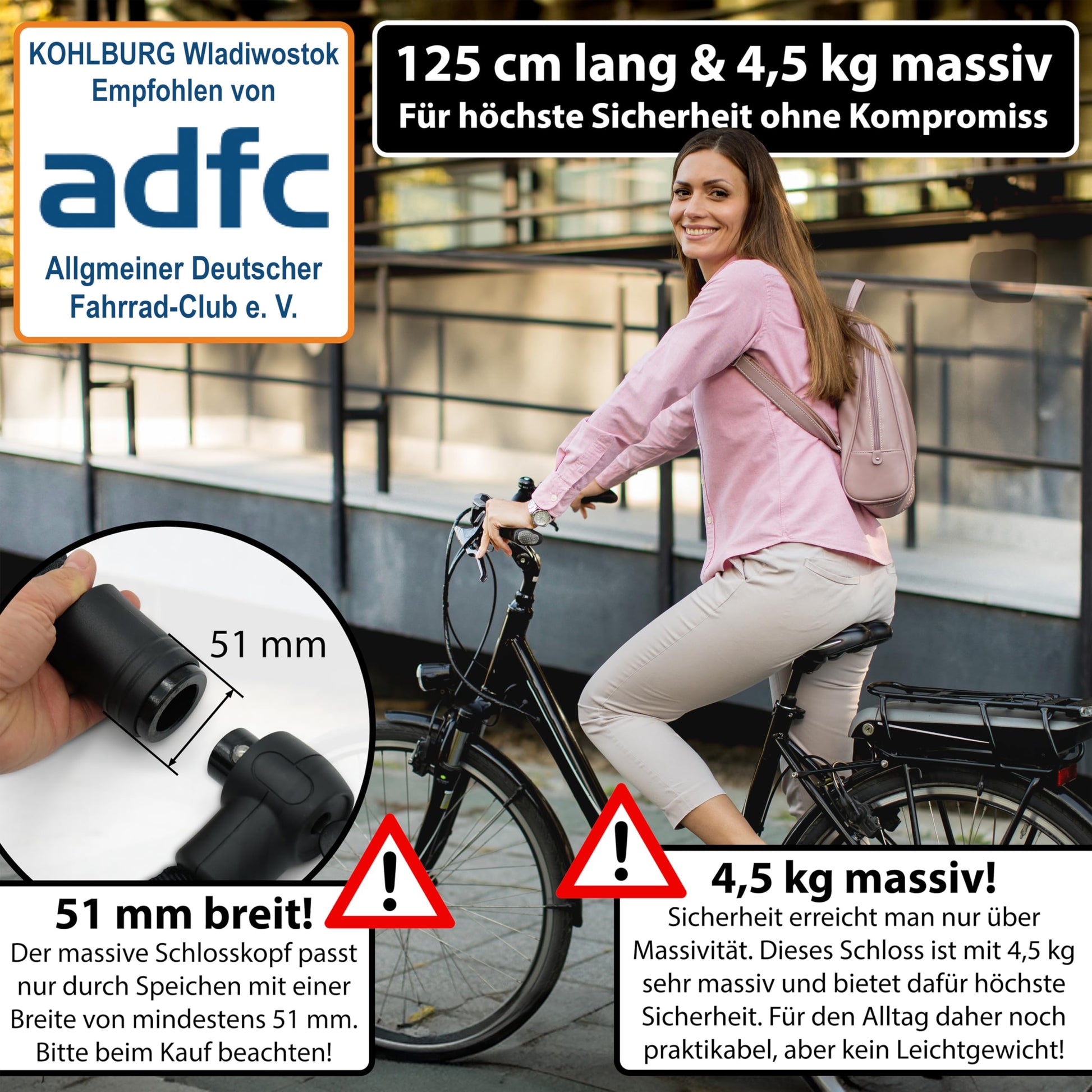 - Grosszügige Länge: Mit 125 cm Länge ermöglicht das Schloss das bequeme Sichern von einem oder mehreren Zweirädern, auch an breiten Objekten wie Laternen oder Bäumen.