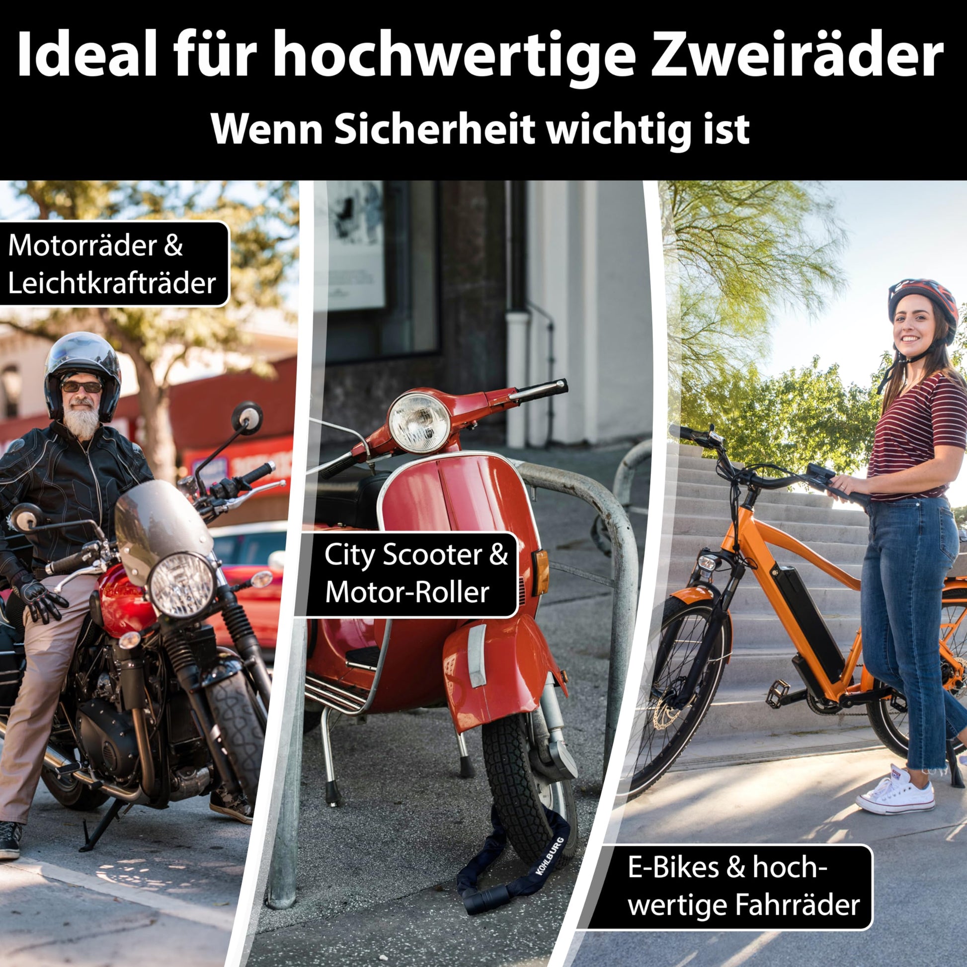 Durch seine massive Bauweise ist es die ideale Wahl für den kompromisslosen Diebstahlschutz von wertvollen Fahrzeugen wie Motorrädern, E-Bikes, Scootern und E-Rollern. Für leichtere, unmotorisierte Velos eignet es sich aufgrund des hohen Gewichts von 4,5 kg vor allem als stationäres Schloss, das an einem festen Ort (z.B. zu Hause oder am Arbeitsplatz) deponiert wird.